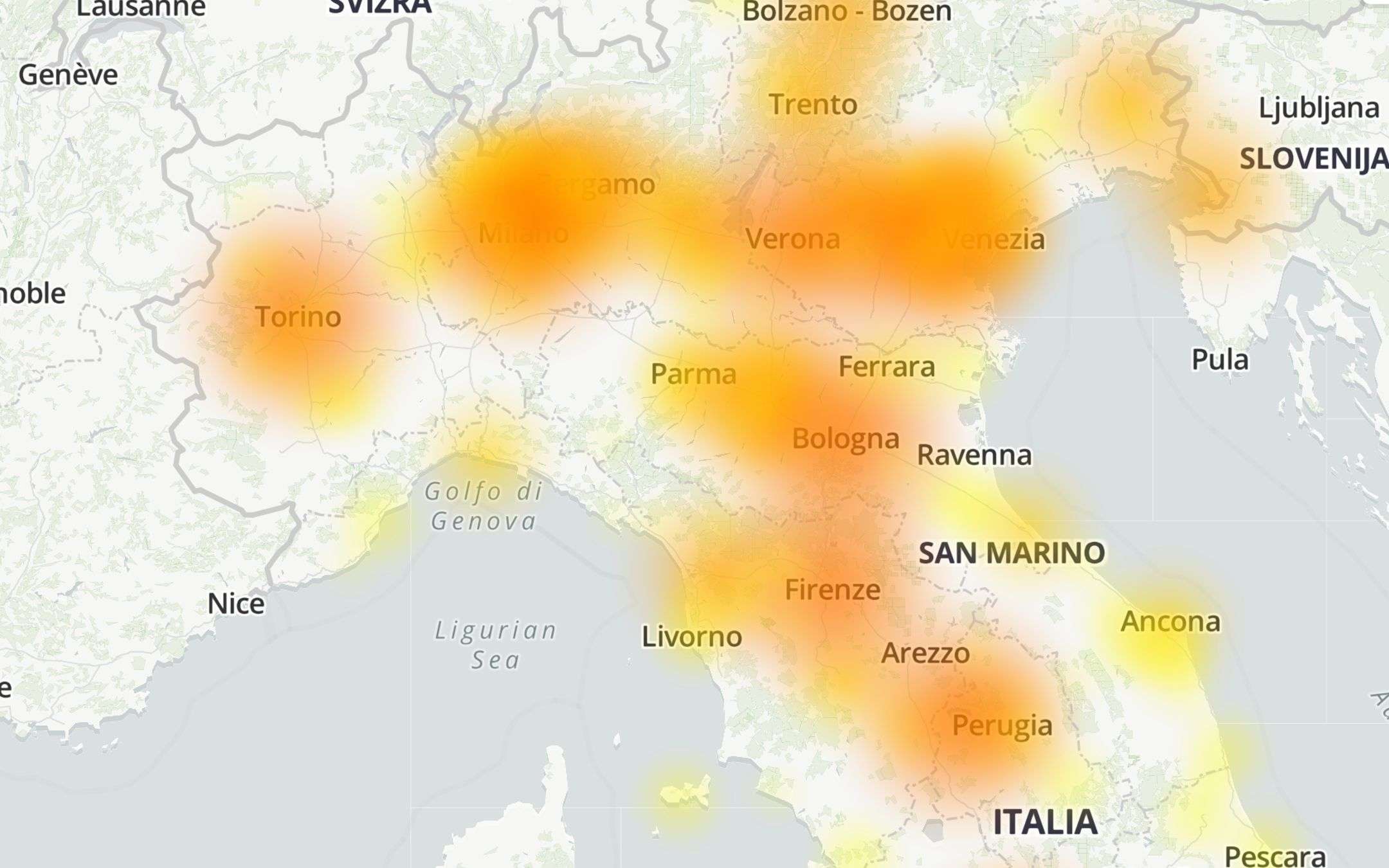 Le principali aree che sembrano soffrire di malfunzionamenti di rete sono quelle intorno alle città di:
