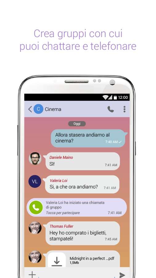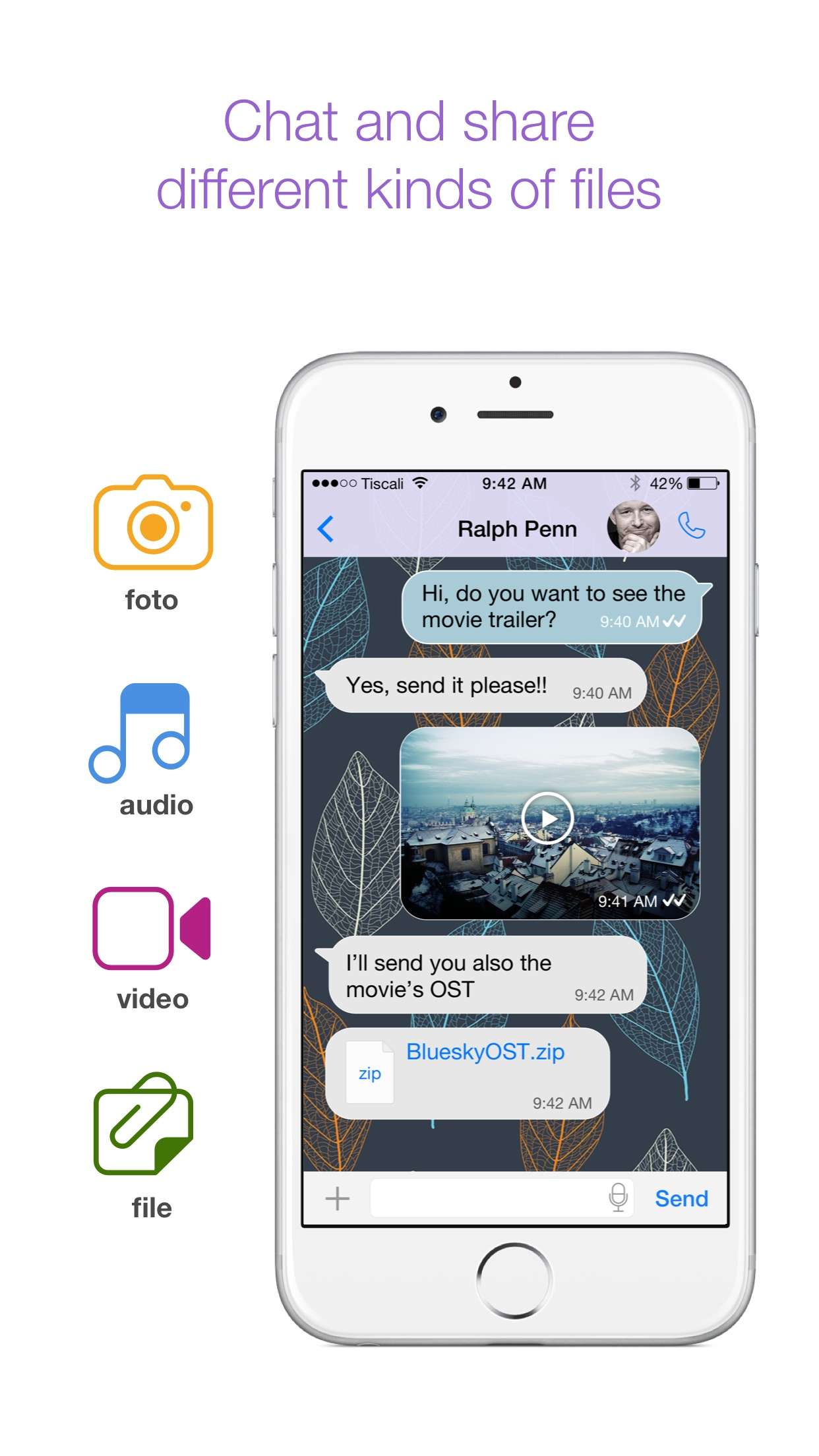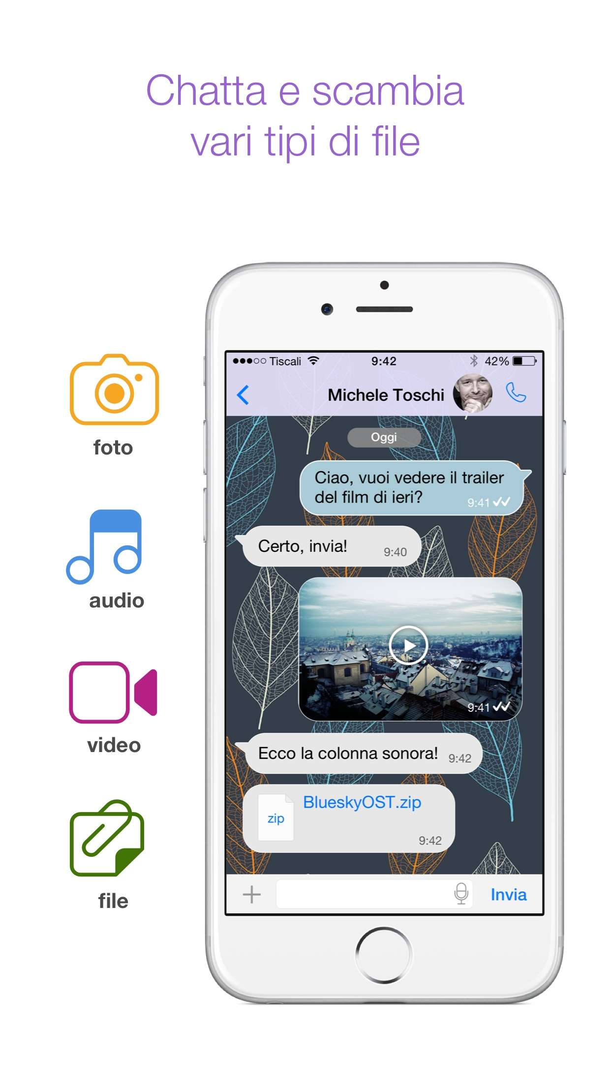 Con Indoona 3.0 anche la chat si arricchisce: è possibile scambiare tutti i tipi di file, non solo foto, musica, e video ma anche documenti, pdf, presentazioni e tanti altri, per rendere l’esperienza della chat ancora più completa sia da smartphone che da PC.