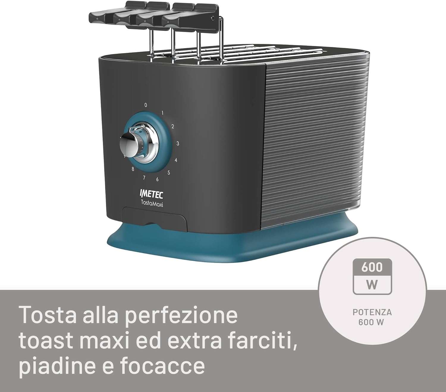 Questo ottimo tostapane di Imetec, è caratterizzato dalla presenza di fessure extralarge grazie alle quali avrai la possibilità di tostare tutti i tipi di pan carré. Dunque, le due pinze in acciaio Inox con fondo chiuso ti consentiranno di evitare che il formaggio coli, sono apribili a 360° e in base alle tue esigenze potrai tranquillamente regolarle in larghezza, così da poter preparare toast normali o dei buonissimi MAXI toast.
