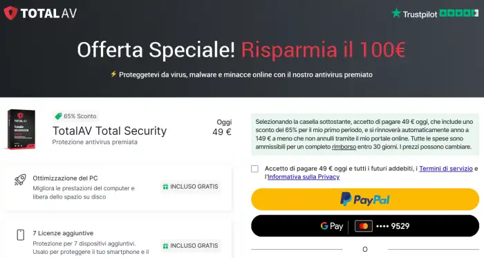 Il software in questione si chiama TotalAV Total Security e solo per poco tempo è disponibile al prezzo di 49€ invece di 149€: uno sconto del 65% per un risparmio netto di 100€. Andiamo a scoprire nel dettaglio tutte le funzionalità di questo tool.
