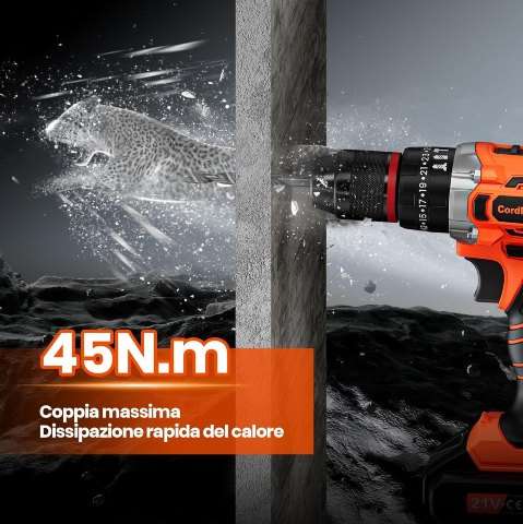 Il trapano si presenta con un mandrino rinforzato da 10mm che risulta più stabile e solido rispetto ai cacciaviti elettrici ordinari. Il motore, dotato di 45Nm di coppia massima e di un motoriduttore in rame con doppio cuscinetto, assicura prestazioni elevate e duratura per lavori di foratura e fissaggio su legno, metallo, plastica e altri materiali.