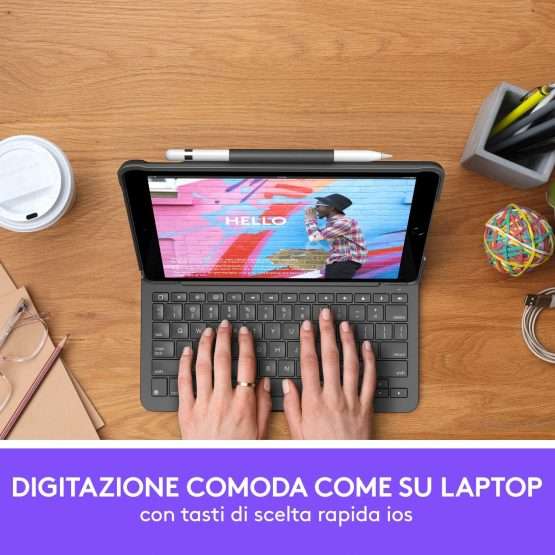 Compatibile con la settima, ottava e nona generazione di iPad, la Logitech Slim Folio è la custodia 2 in 1 che ti permette di ottenere ancora di più dal tuo dispositivo Apple. A te basta incastrare al suo interno il tablet ed ecco che hai tutto a disposizione.