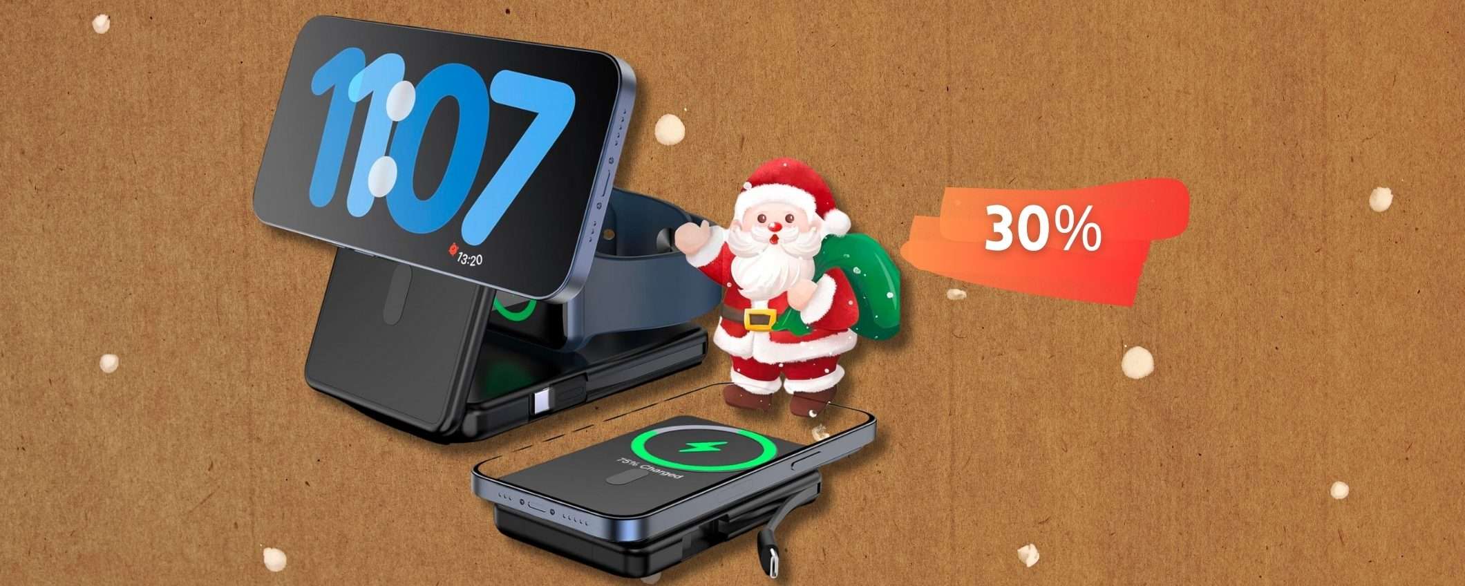 Ma veniamo a noi, il prodotto ha dimensioni minime ed è facile da mettere in tasca così da averlo sempre a portata di mano. Ha un cavo integrato che rende l’utilizzo semplice e la ricarica istantanea. Puoi posizionarlo in varie modalità così da usarlo anche come stand e ricaricare il tuo smartphone con il Magsafe nel mentre. Se hai le AirPods con custodia di ricarica wireless appoggiale semplicemente per metterle in carica. E lo smartwatch? Beh, per il tuo Apple Watch c’è un piccolo stand magnetico che si alza e che ti permette di farlo tornare come nuovo.