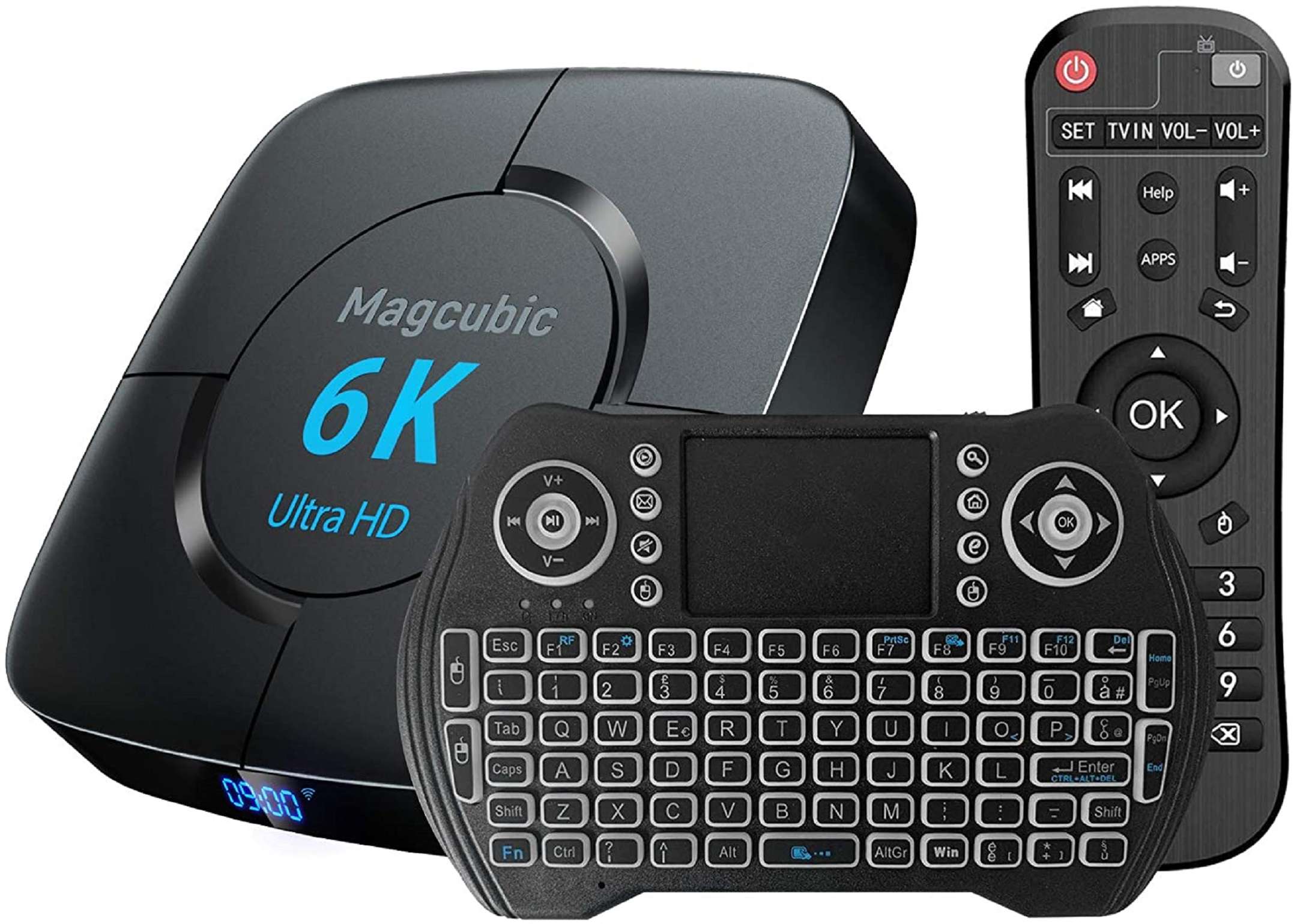 Il device ha una connessione Bluetooth 4.1 integrata utile per connettere qualsiasi dispositivo Bluetooth come un telefono, una tastiera senza fili, mouse, gamepad, cuffie, casse e altro ancora. Proprio la tastiera senza fili è un accessorio presente nella confezione di vendita di questo Tv Box Android Magcubic insieme al classico telecomando. Inoltre supporta la tecnologia dello schermo mirroring Airplay DLNA AirScreen: dopo aver connesso il dispositivo alla reta WiFi domestica, potrete condividere contenuti direttamente dal vostro smartphone, tablet o PC che supportano tale tecnologia.