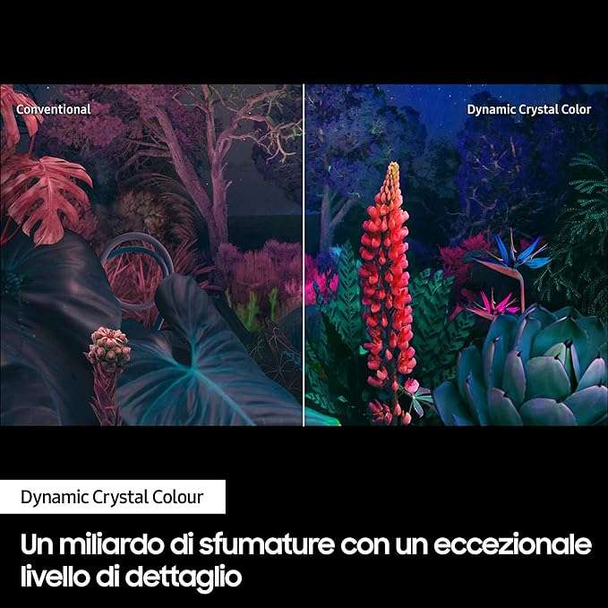 Questa magnifica TV Smart, è caratterizzata dalla presenza di un Processore Crystal 4K, graie al quale avrai la possibilità di guardare i tuoi film preferiti godendo di immagini ricche di sfumature di colore in 4K. Grazie alla tecnologia HDR, le scene buie e luminose saranno molto più nitide, il Contrast Enhancer ti permetterà invece di ottimizzare profondità e colore.