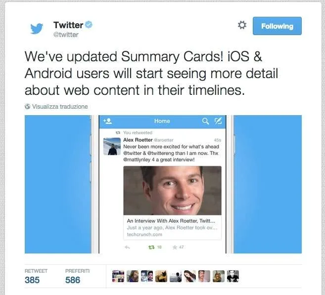 Twitter ha annunciato, ovviamente con un tweet, di aver migliorato i riquadri del sommarietti (Summary Cards) sulle sue app iOS e Android in modo da includere ulteriori informazioni ai contenuti Web sulle timeline degli utenti.