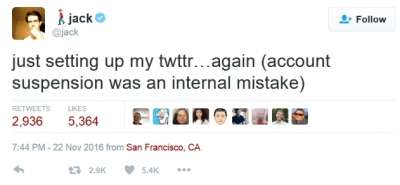 I privilegi Twitter di Dorsey sono infatti stati sospesi per sbaglio, sbattendolo fuori dal servizio che lui stesso ha contribuito a creare. Una volta che l'account è stato riattivato, il giorno dopo, risultavano meno di 200 seguaci al posto dei soliti 3,8 milioni, che però sono ritornati nel giro di breve tempo. Dorsey ha detto che un "errore interno" è stato il motivo che ha causato la sospensione. Piccola cusiosità: quando l'account è stato riattivato, Dorsey ha twittato "just setting up my twttr…again (account suspension was an internal mistake)", riprendendo il suo primissimo tweet inviato il 21 marzo 2006. Quel tweet diceva "just setting up my twttr".