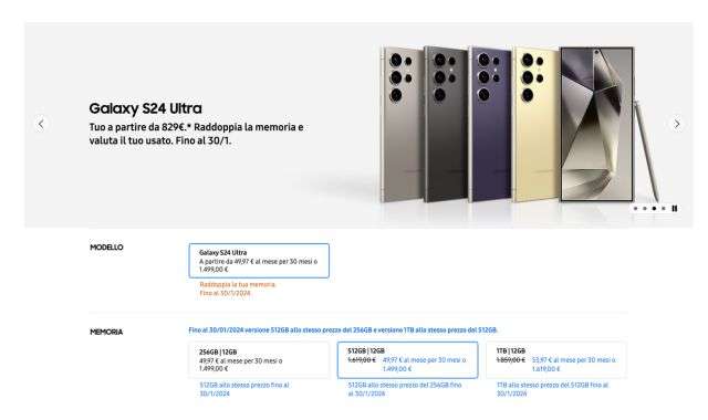 Ad esempio, puoi acquistare il modello Galaxy S24 da 512GB allo stesso prezzo della variante del 256GB: e con lo sconto da 100 euro capisci che diventa ancora più conveniente.
