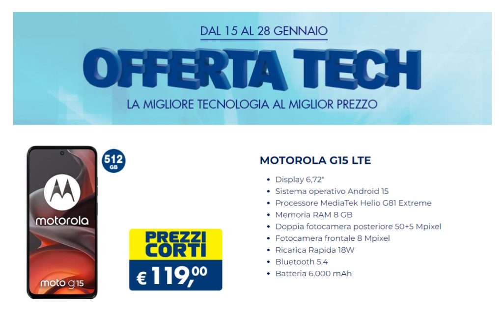 Fino al 28 gennaio c’è una nuova offerta tech da Esselunga: Motorola G15 LTE con 512 GB di spazio di archiviazione al prezzo scontato di 119 euro. Una promo particolarmente interessante per chi cerca un midrange completo, con tanta memoria, autonomia elevata e funzioni avanzate.