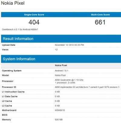 1GB è il quantitativo di RAM e Android 7.0.1 Nougat il sistema operativo pre-installato. Il cosiddetto Nokia Pixel ha fatto segnare un punteggio di 404 nel test single-core e 661 nel test multi-core. Punteggi non molto alti, che collocano il dispositivo certamente nella fascia entry level. Staremo a vedere se questo device sarà uno di quelli che Nokia presenterà l'anno prossimo a Barcellona.
