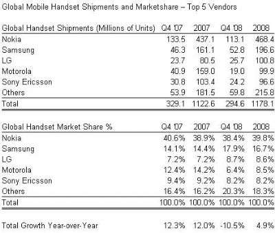 Neil Mawston, direttore di Strategy Analytics, ha aggiunto, "Tre dei cinque principali produttori al mondo di cellulari hanno registrato tassi di crescita annuale negativi nel quarto trimestre 2008. Motorola è scesa del 54%, mentre Sony Ericsson e Nokia hanno fatto registrare rispettivamente meno 21% e meno 15%. Con volumi e ricavi in calo, gran parte del settore della telefonia mobile sarà inevitabilmente costretta a concentrasi sui costi e sulla profittabilità"