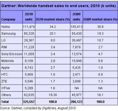 Nokia mantiene la leadership con una quota di mercato del 34,2%, anche se in calo di oltre due punti su base annua. Secondo posto a Samsumg con il 20,1%, segue LG (9,0%), mentre RIM e Sony Ericsson condividono il quarto posto.