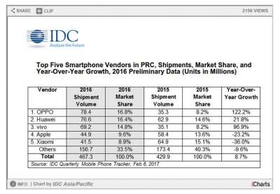 Secondo un rapporto pubblicato recentemente dalla società di ricerche di mercato IDC, Oppo è il leader dei produttori di smartphone che hanno venduto di più in Cina nel 2016.