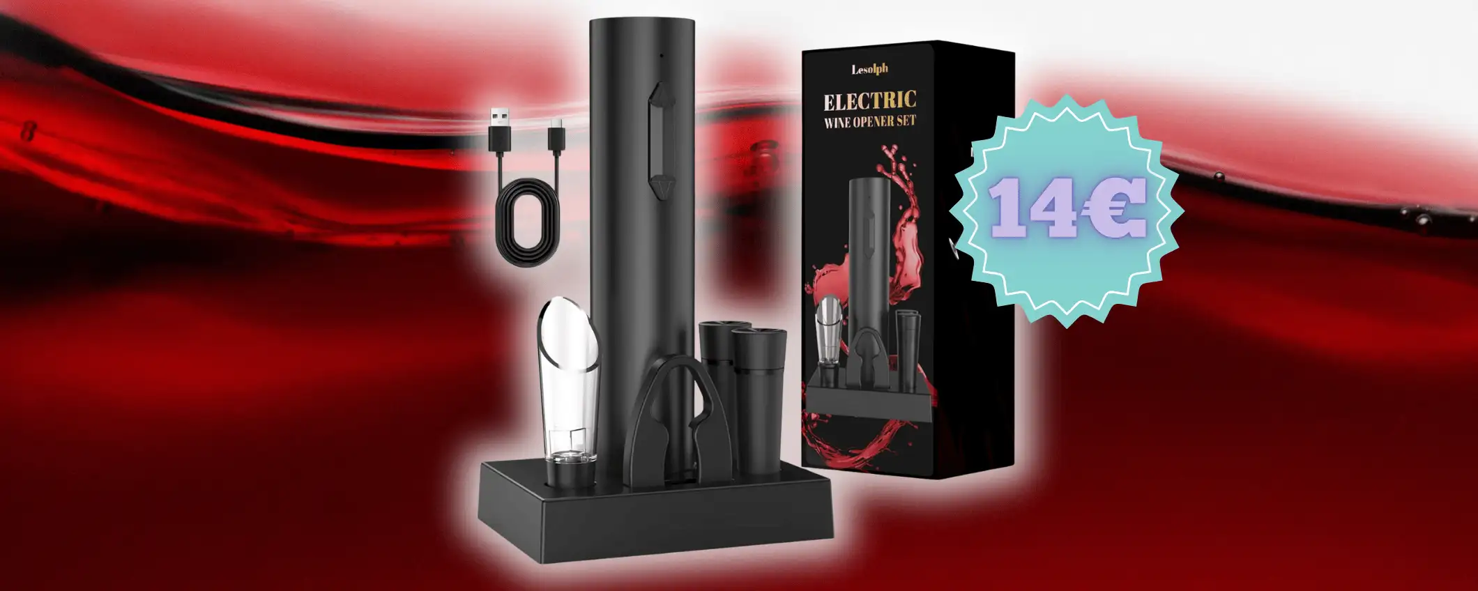 Se hai difficoltà ad aprire le bottiglie di vino o non vuoi fare figuracce in queste feste, gioca d’astuzia con un escamotage intelligente e anche astuto a vedersi. Farai rimanere tutti a bocca aperta quando tirerai fuori il tuo cavatappi elettrico che fa tutto al posto tuo. Un set incredibile con quello di cui hai bisogno. Approfitta dello sconto del 19% su Amazon per comprarlo subito a soli 14,51 euro.