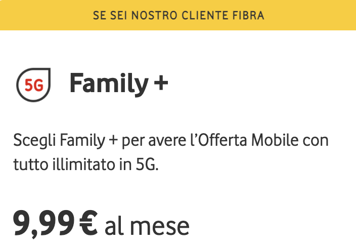 Family+ di Vodafone è la promozione esclusiva a meno di 10 euro al mese con traffico voce e internet illimitato in 5G alla massima velocità. Questa tariffa è attivabile solo da chi decide di attivare o ha già attiva la Fibra dell’operatore rosso.