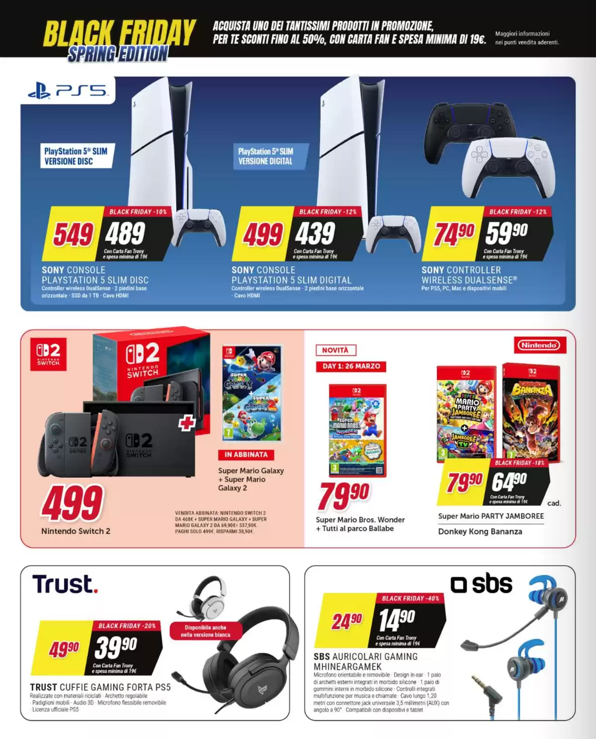 Da Trony è arrivato il Black Friday Spring Edition: la versione primaverile del periodo di sconti più amato dell’anno è protagonista del nuovo volantino, attivo fino al 1° aprile nei punti vendita della catena. La promozione, che offre sconti fino al 50%, è riservata ai titolari di Carta Fan Trony (gratuita), per una spesa minima di 19 euro.