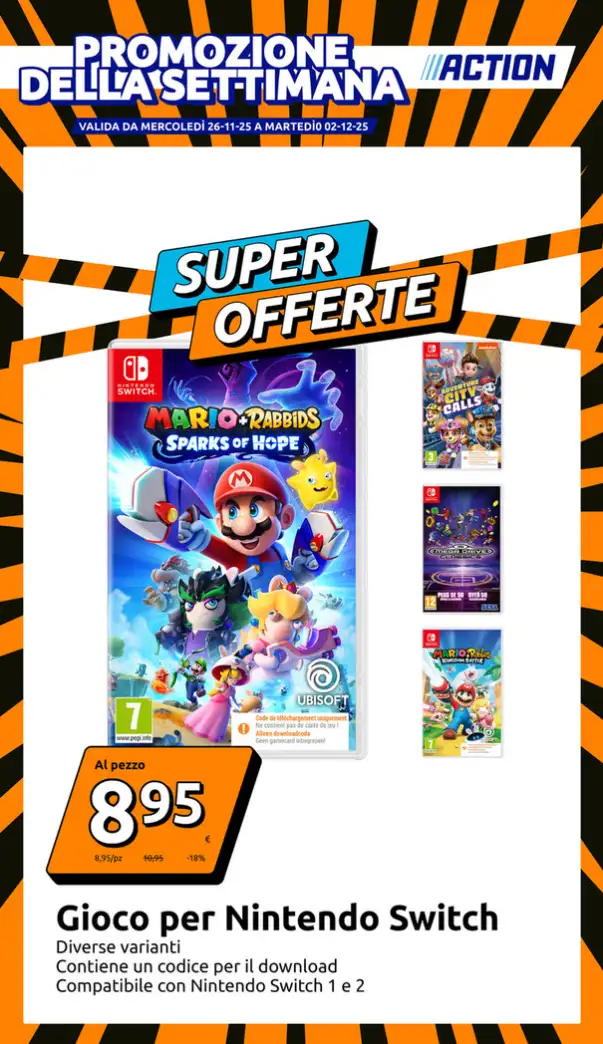 La promo più interessante del nuovo volantino sono, senza dubbi, i giochi per Nintendo Switch a soli 8,95 euro: sono disponibili diversi titoli, da Mario+Rabbids (sia Kingdom Battle che Sparks of Hope) a Sega Mega Drive Classics, passando per Justice League Cosmic Chaos. Non triple A, ma sicuramente un’occasione per fare un regalo gradito. Importante sottolineare che si tratta di codici download e non schede fisiche. Tutti sono compatibili sia con Nintendo Switch 1 che 2.