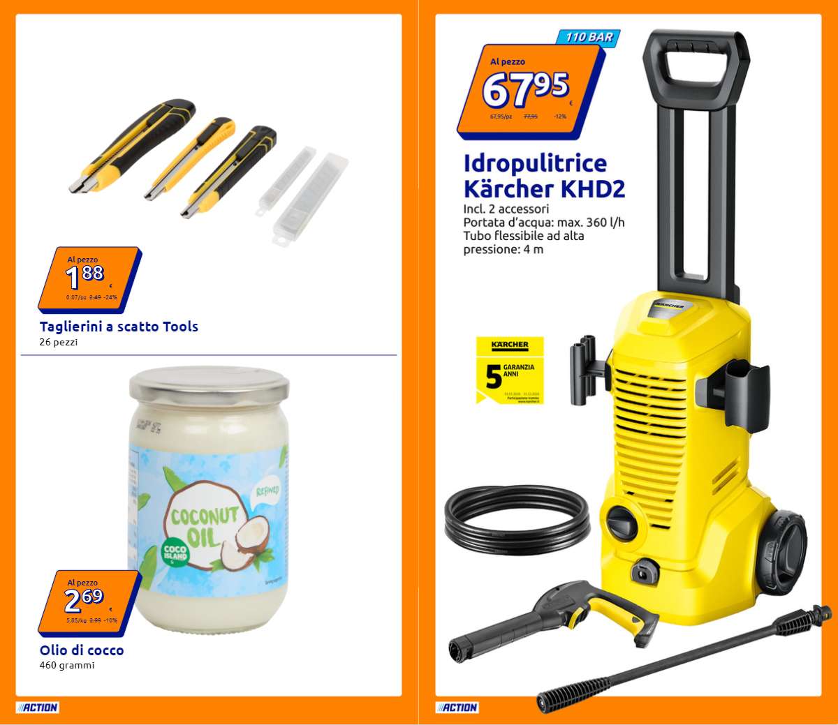 Pezzo forte di questo nuovo volantino Action è l’idropulitrice Karcher KHD2 a soli 67,95 euro, scontata del 12%: include due accessori e tubo flessibile ad alta pressione da 4 metri. È perfetta per pulire il giardino o il terrazzo in profondità. Sempre in ambito fai da te, segnaliamo il set chiavi a bussola e punte da 42 pezzi a 9,95 euro e il set di attrezzi da 25 pezzi a 7,77 euro.