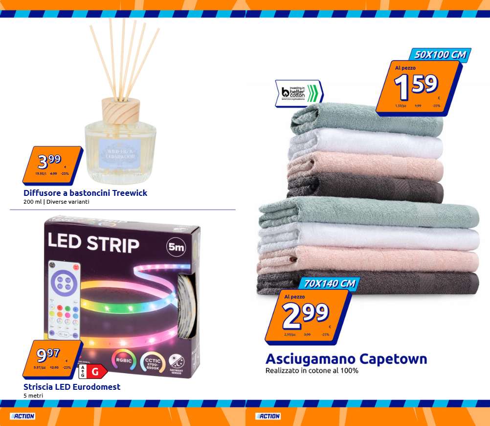 Per chi ama decorare la propria casa, Action propone diverse offerte davvero interessanti: dalla striscia LED da 5 metri RGB a 9,97 euro (-23%) al diffusore a bastoncini Treewick a 3,99 euro (-20%), passando per il pannello LED Baltimore da 29 centimetri di diametro a 9,95 euro (-33%) e il pratico puff contenitore in peluche XL a 11,95 euro (-14%).