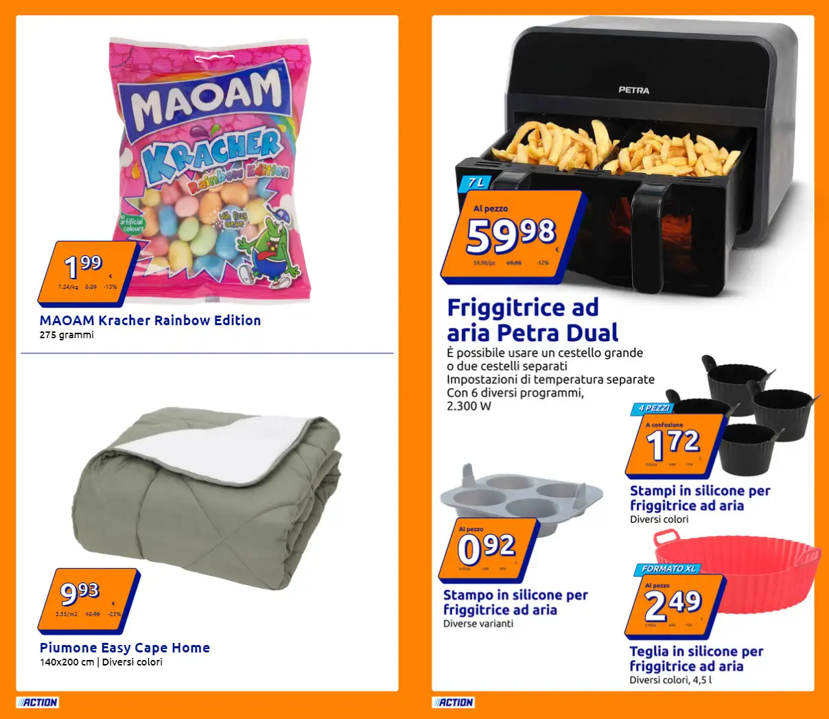 L’offerta principale riguarda la friggitrice ad aria Petra Dual, con ben due cestelli dalla capienza complessiva di 7 litri: ti permette di preparare due porzioni della stessa pietanza, oppure due piatti diversi contemporaneamente. La trovi in offerta a 59,98 euro con il 12% di sconto. In abbinata, anche tanti accessori e stampi in silicone a partire da 92 centesimi.