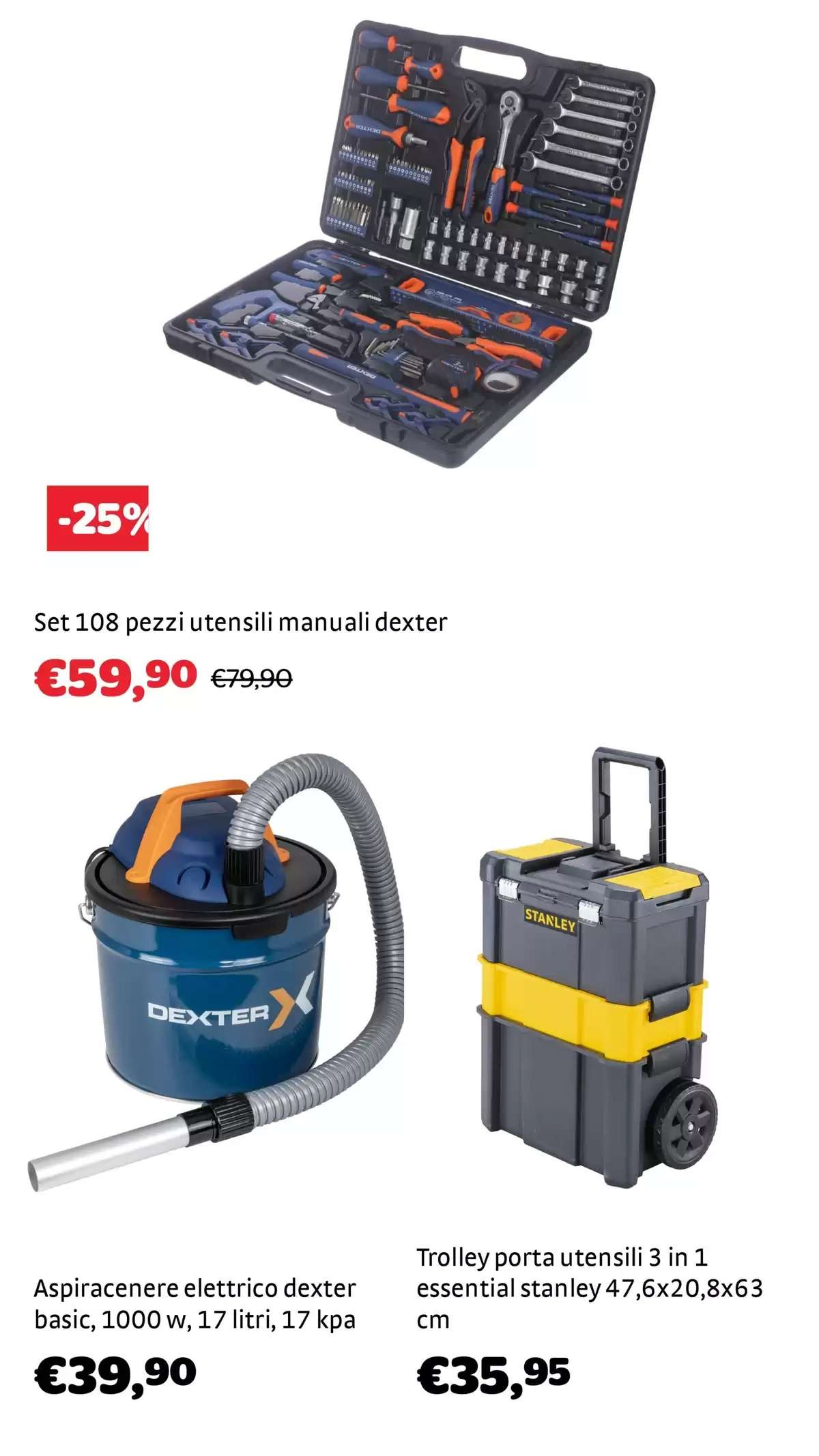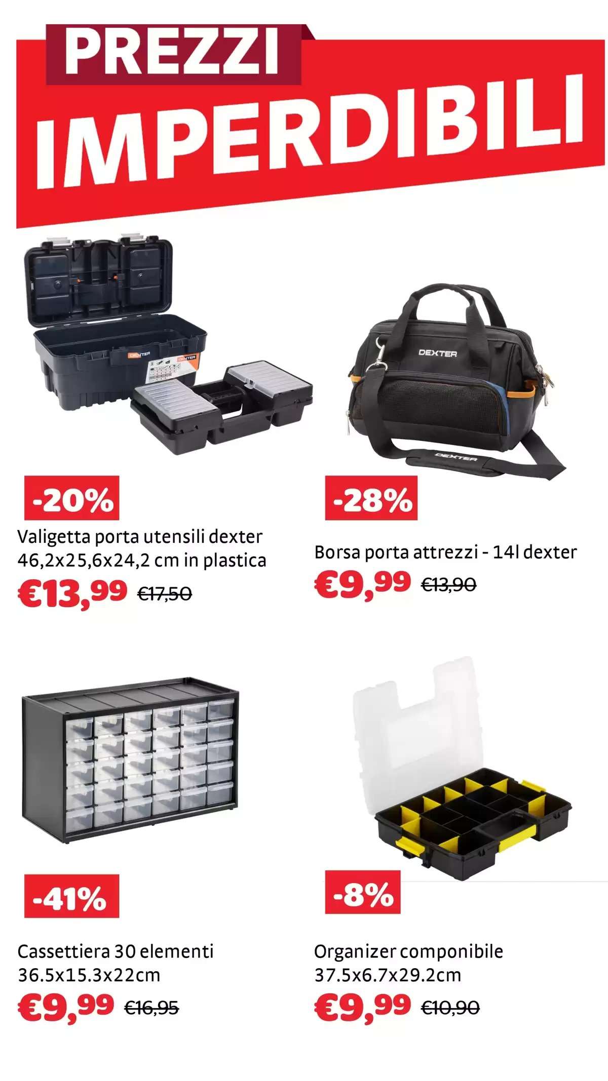 Infine, un’intera sezione è dedicata agli “indispensabili" a marchio Dexter. Come il taglierino in plastica trimateriale e lama in acciaio a 3,99 euro (-11%), il mini giravite di precisione con 35 bits a 7,99 euro (-38%), giravite con bits e bussole 48 pezzi e set 33 pezzi punte+bits assortiti entrambi a 9,99 euro, giravite a cricchetto con 30 bits a 5,99 euro (-45%) e forbice da elettricista professionale a 4,99 euro (-28%).