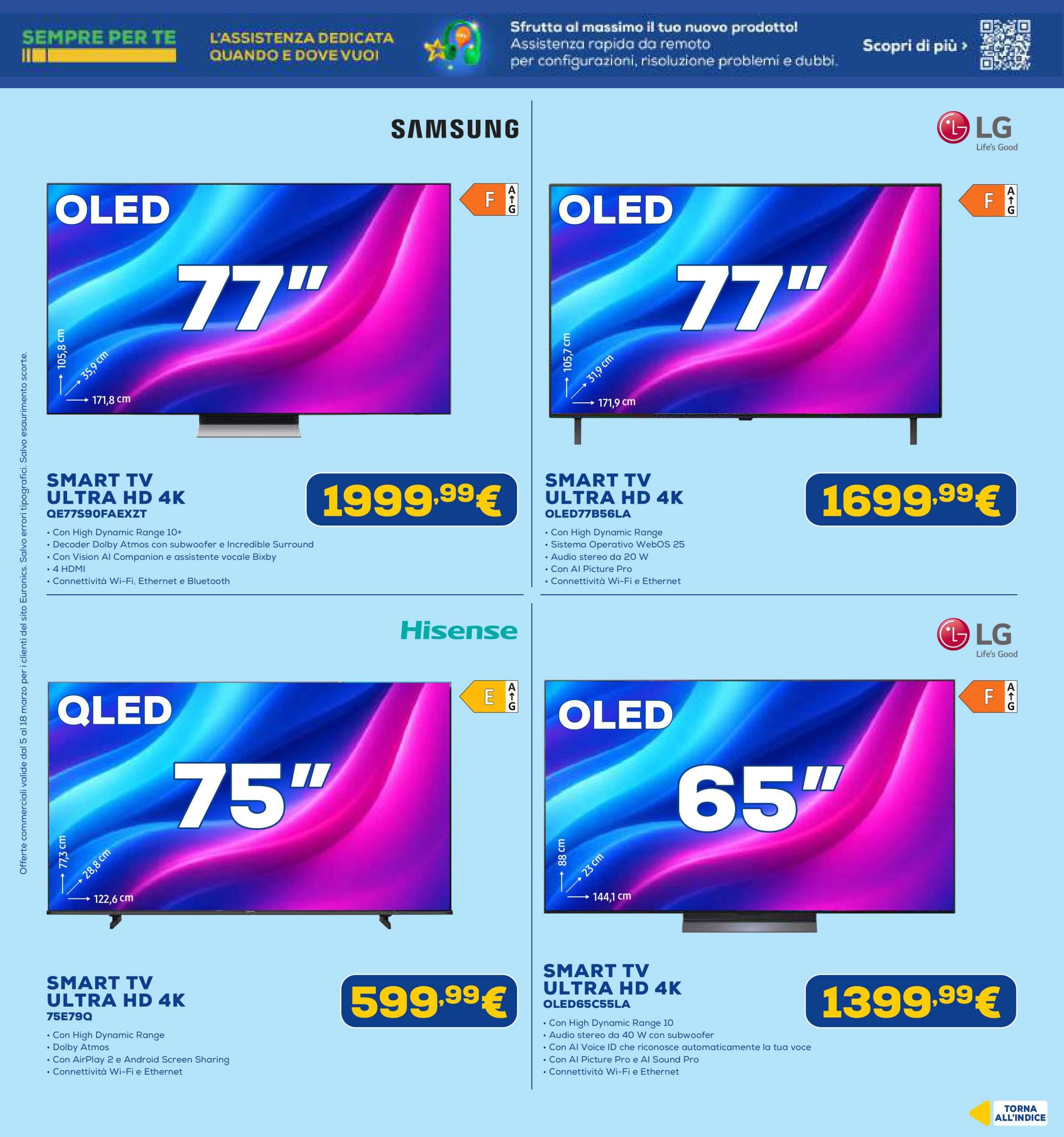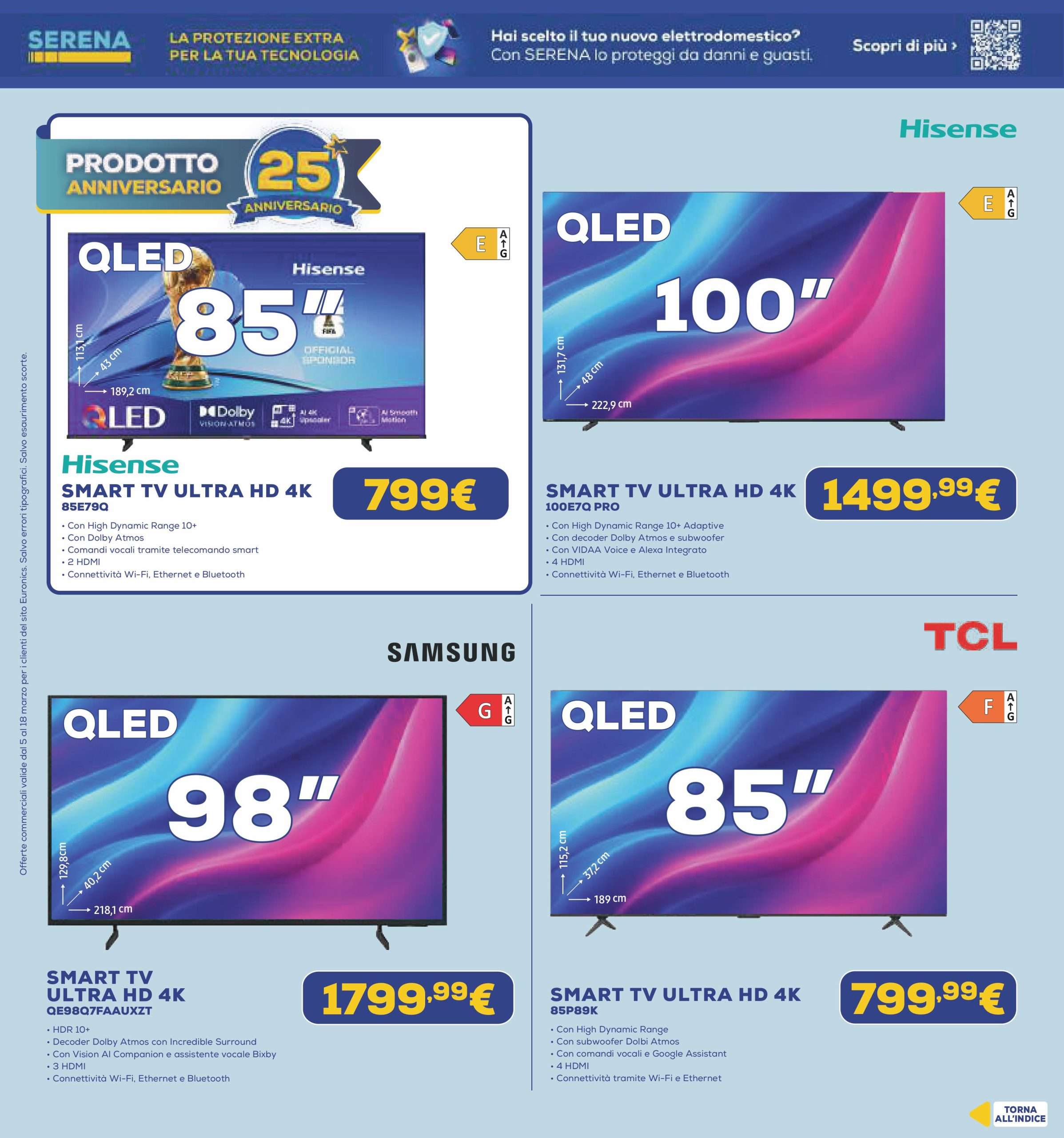 Una vera chicca è la Smart TV Ultra HD 4K di Hisense a 799 euro. Da ben 85", supporta HDR 10+, Dolby Atmos e comandi vocali tramite telecomando smart. Offre 2 ingressi HDMI e connettività Wi-Fi, Ethernet e Bluetooth.