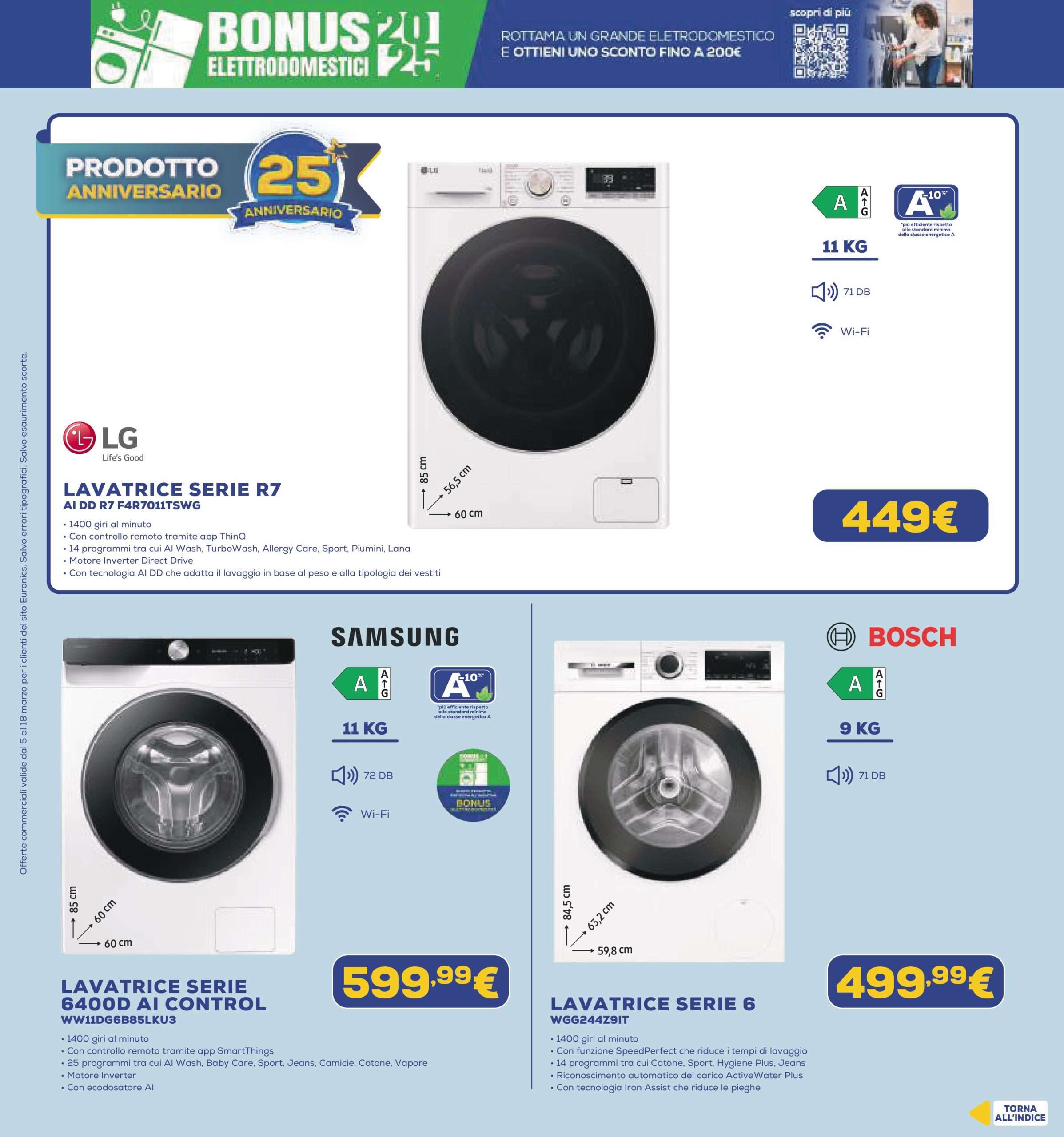 Apre la carrellata di offerte la lavatrice LG Serie R7 a 449 euro da 11 kg: classe A, supporta controllo remoto tramite app ThinQ e offre 14 programmi tra cui AI Wash, TurboWash, Allergy Care, Sport, Piumini e Lana. Il motore è inverter Direct Dive. Inoltre, la tecnologia AI DD adatta il lavaggio in base al peso e alla tipologia di vestiti.