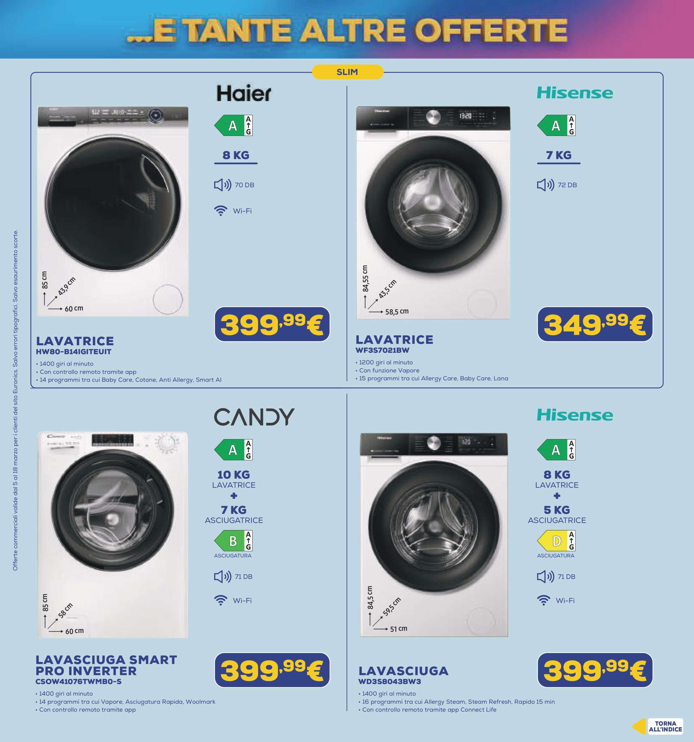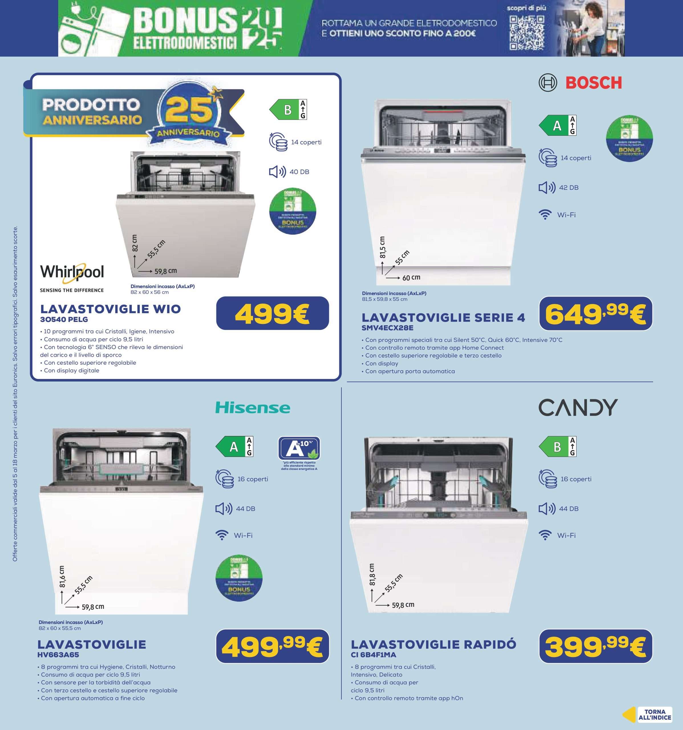 A 499 euro c’è invece la lavastoviglie W10 di Whirlpool da 14 coperti e silenziosa. Offre 10 programmi (tra cui cristalli, igiene e intensivo) e consuma per ogni ciclo 9,5 litri. Con tecnologia 6° senso, rileva le dimensioni del carico e il livello di sporco. Non manca il display digitale.