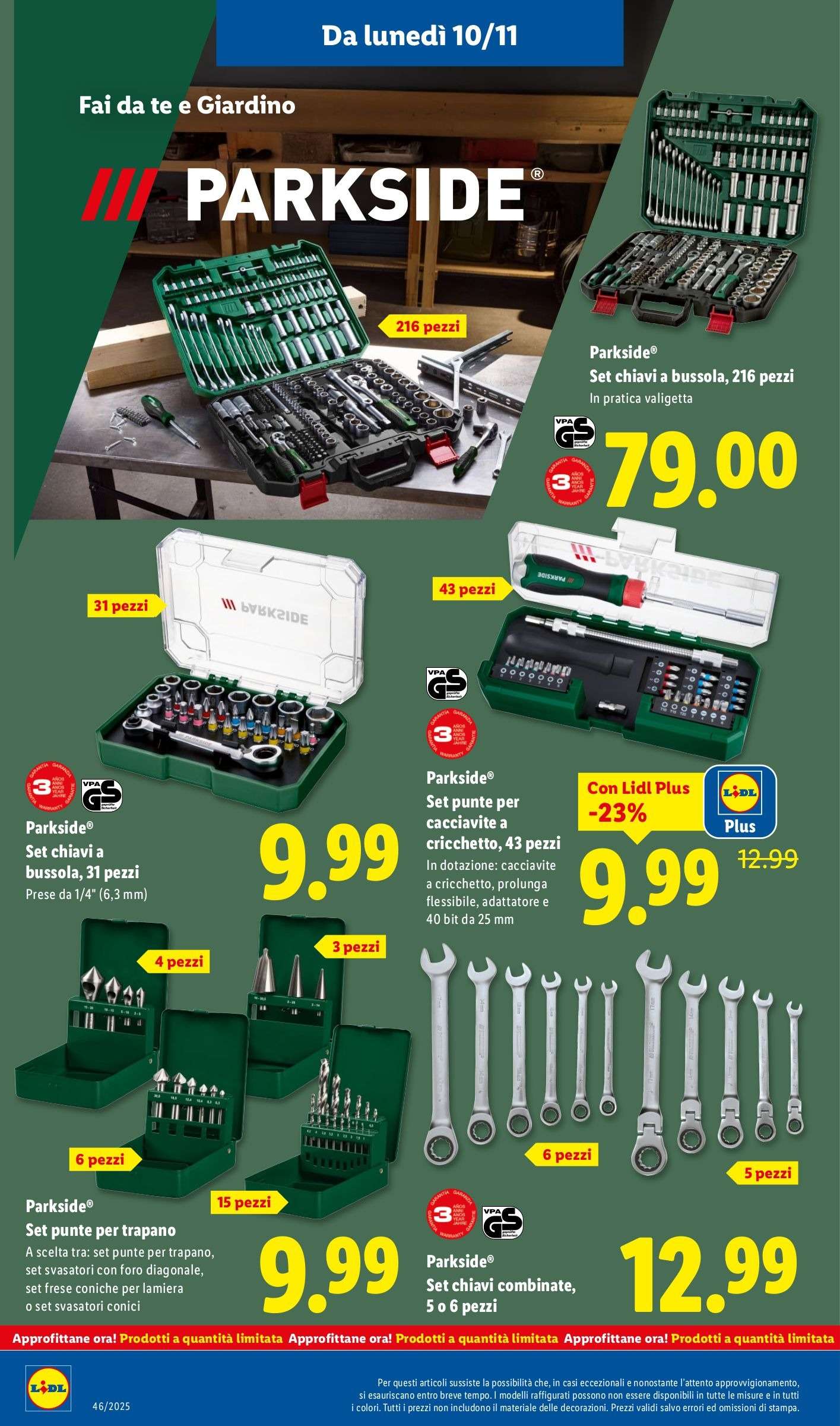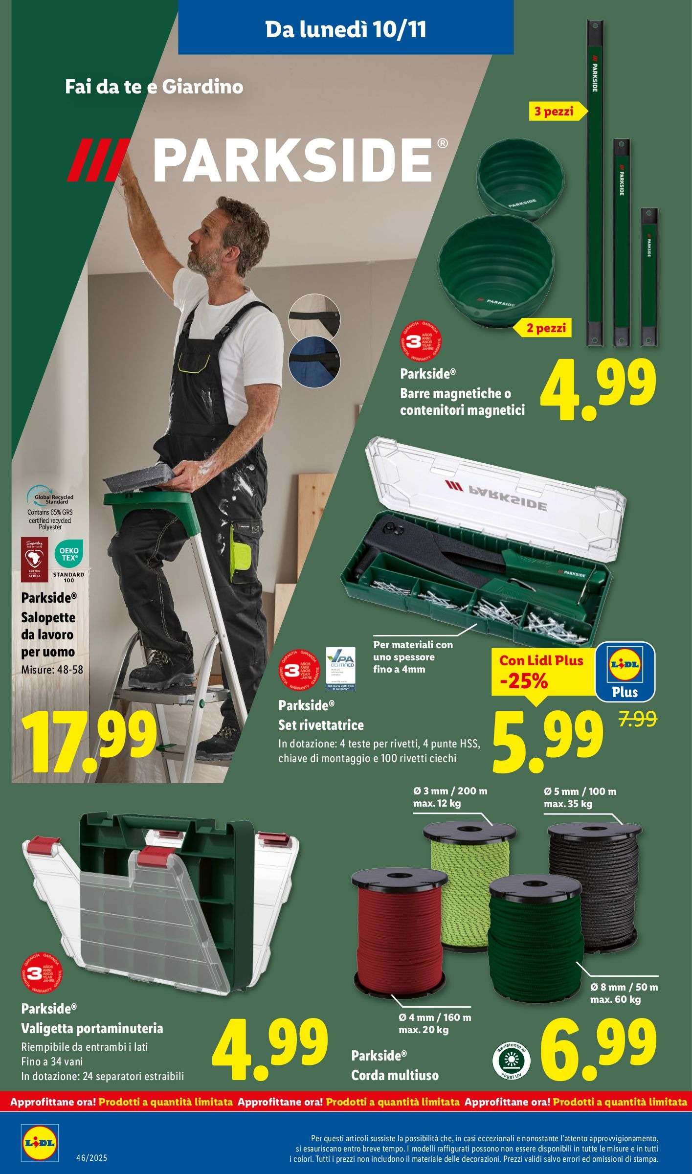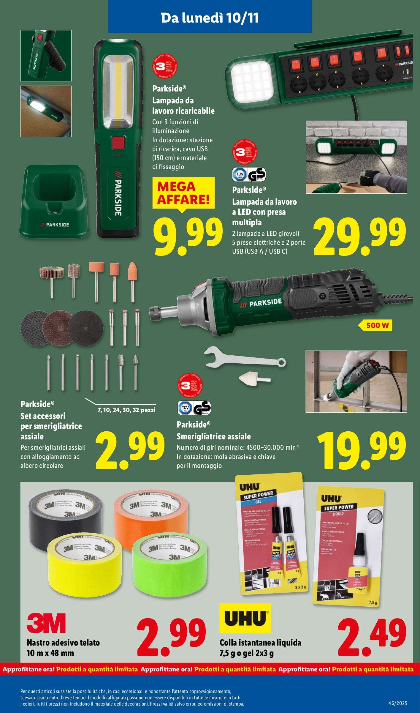 Il nuovo volantino Lidl Parkside sarà attivo da lunedì 10 a domenica 16 novembre in tutti i punti vendita della catena. Attenzione: come sempre le scorte sono limitate, perciò vi consigliamo di affrettarvi se qualcosa dovesse interessarvi.