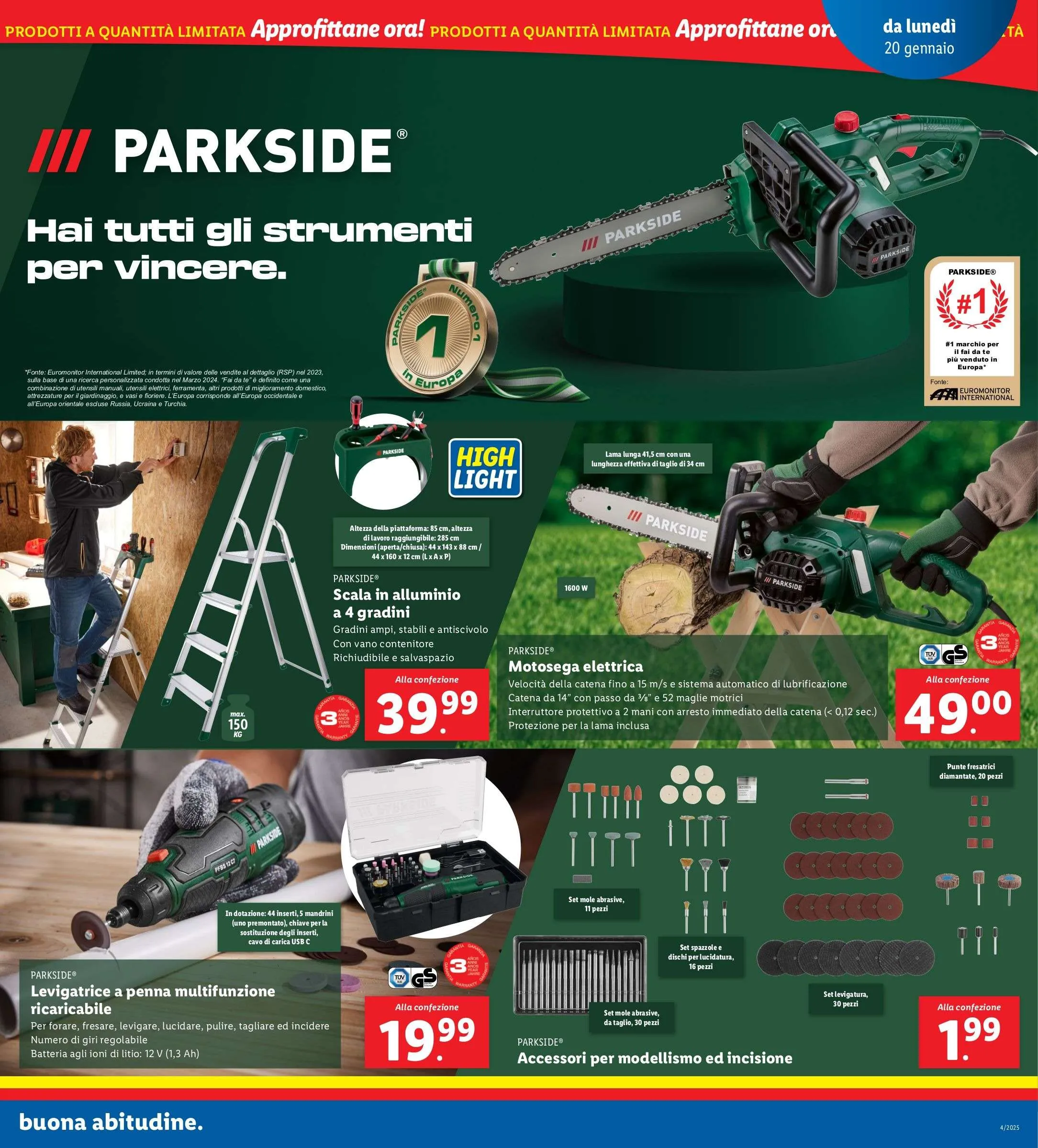 Il volantino Lidl Parkside sarà attivo da lunedì 20 gennaio, fino a domenica 26 gennaio. Come sempre, puoi approfittarne nei supermercati a marchio Lidl, ma attenzione: gli articoli sono disponibili soltanto in quantità limitate.