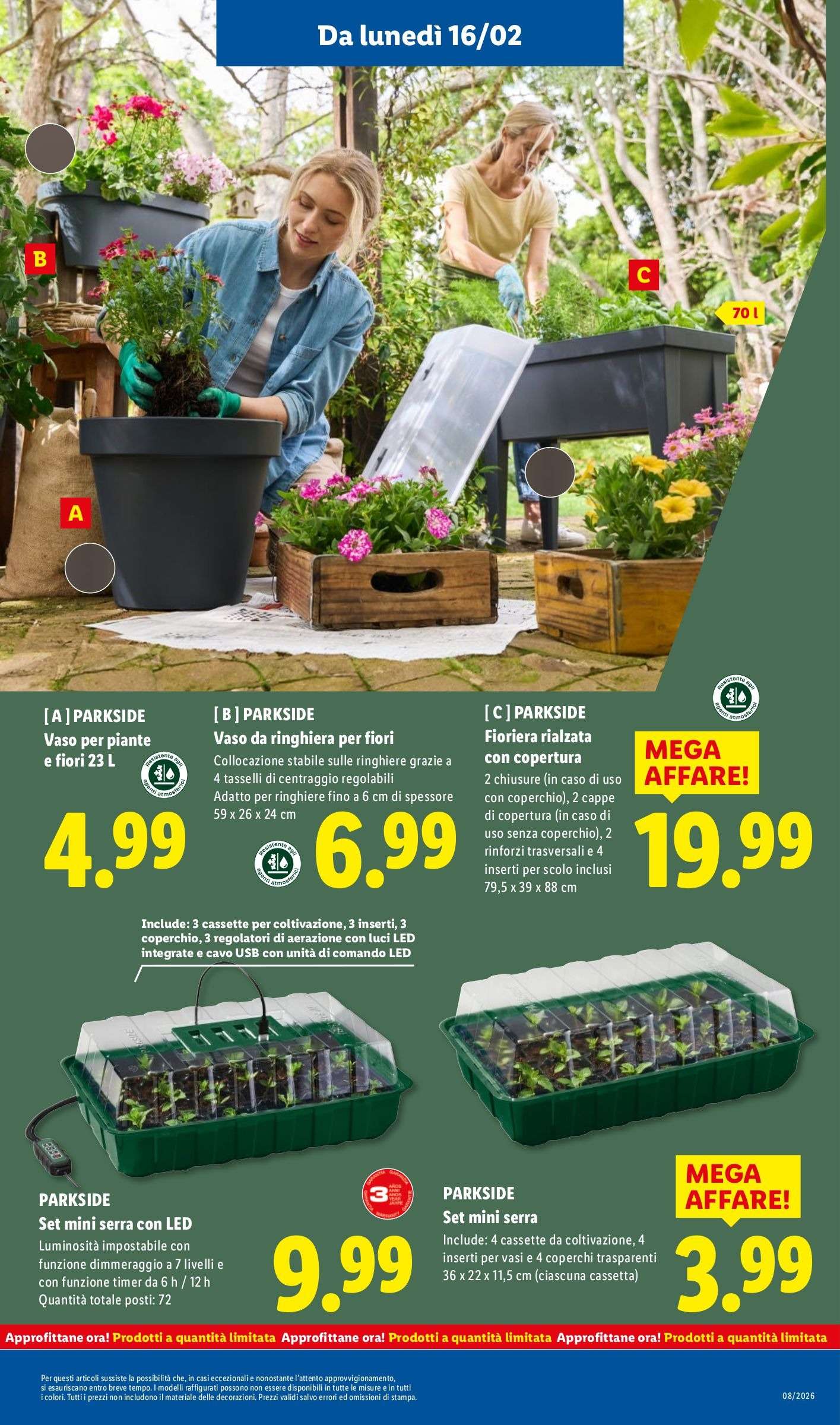 Per il giardinaggio, una carrellata di offerte: vanga, pala o forca a 17,99 euro; portavaso telescopico con rotelle a 4,99 euro; attrezzi a scelta tra rastrello, scopa, zappa doppia, scopa per fughe o vanga tagliabordi a 5,99 euro, set per coltivazione di talee in vetro borosilicato a 6,99 euro, guanti da giardinaggio in nitrile o latex a 2,99 euro e accessori per giardinaggio più in generale a 1,49 euro.