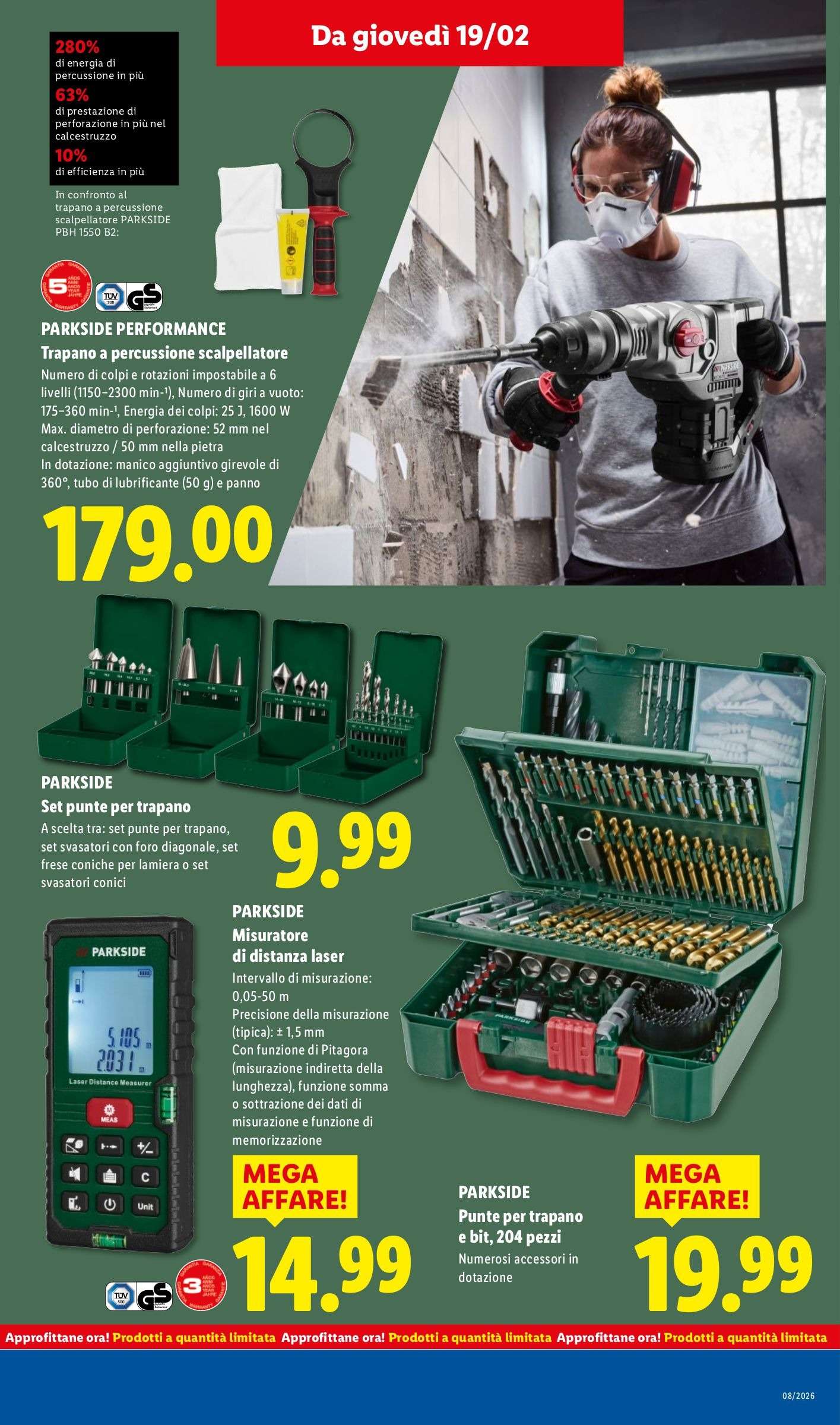 Da giovedì 19 febbraio, invece, saranno disponibili il set seghetto ricaricabile con lama per legno, per metallo e batteria a 59 euro, con tanto di lama di scorta a 9,99 euro disponibile a parte. Per i lavori più impegnativi, c’è il trapano a percussione scalpellatore a 179 euro e tutti gli accessori appositi: dal set di punte a 9,99 euro, al kit con punte e bit da 204 pezzi a 19,99 euro, fino al misuratore di distanza laser a 14,99 euro.