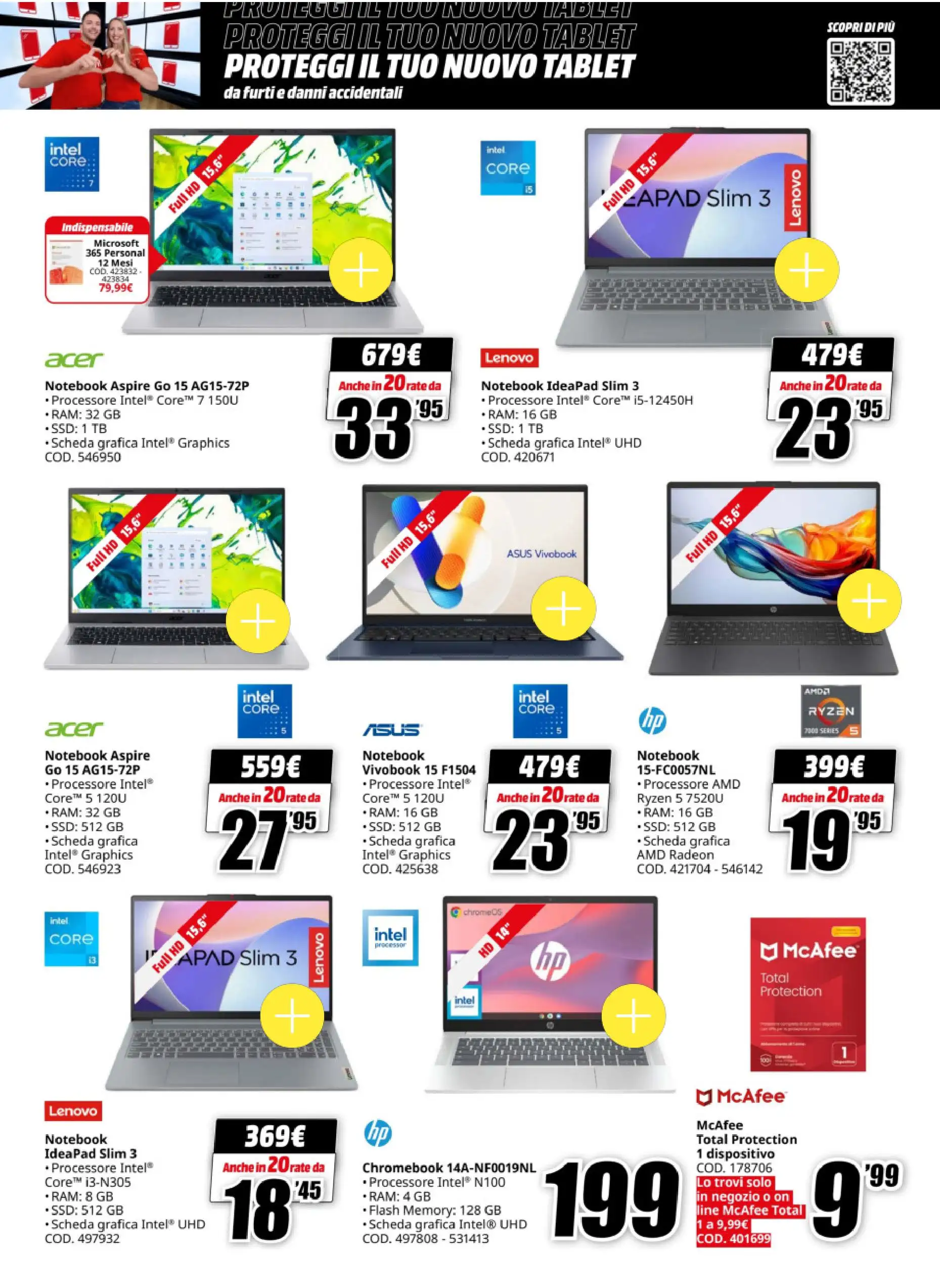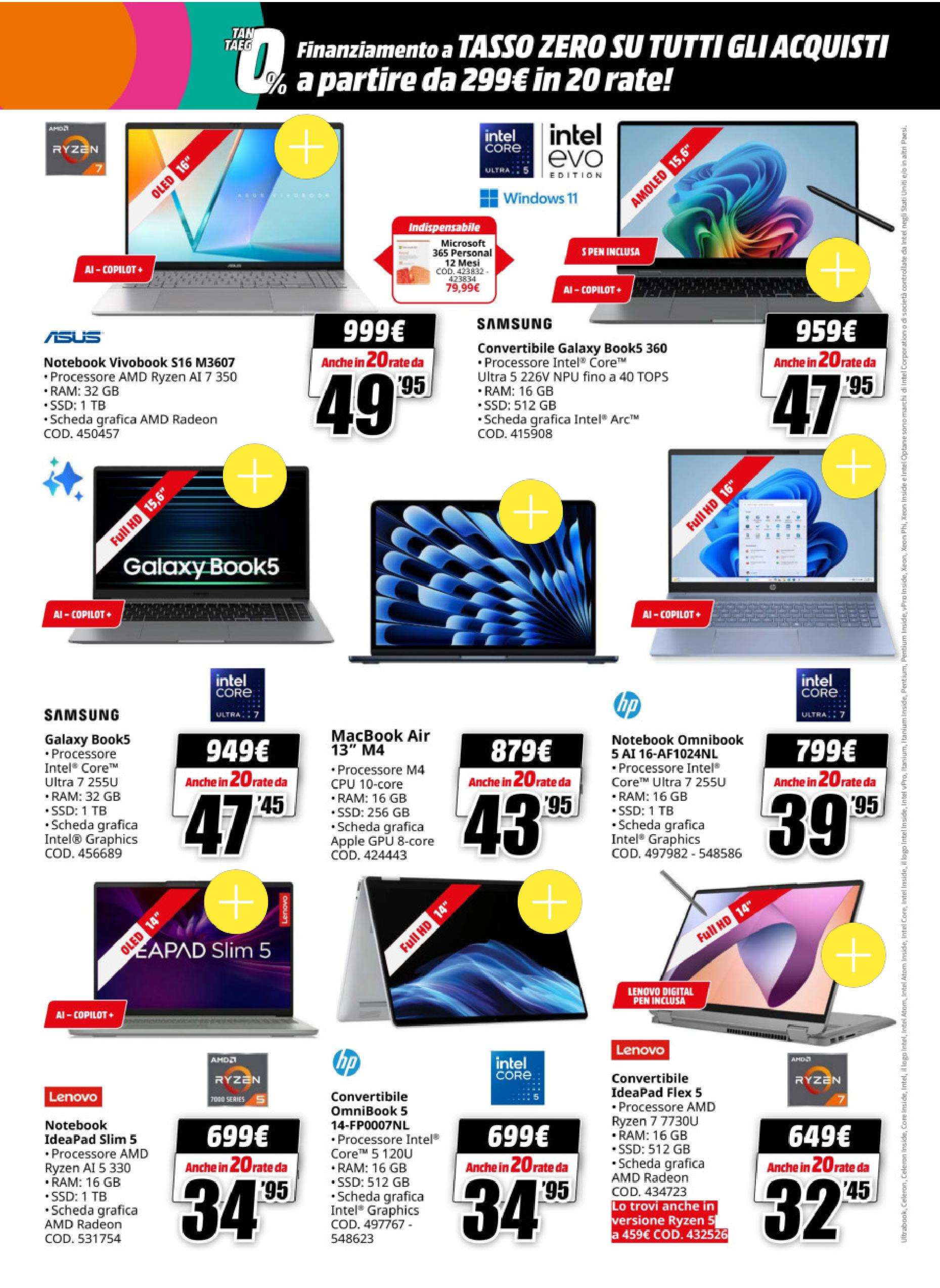 A catturare l’attenzione in questo nuovo volantino è il notebook HP 15-FD0088NL a 529 euro, con possibilità di pagamento a rate. Monta un processore Intel Core i7, 16 GB di RAM, 512 GB di SSD e grafica Intel Iris Xe. L’ideale per lavoro e studio e chi cerca prestazioni elevate senza sforare il budget.