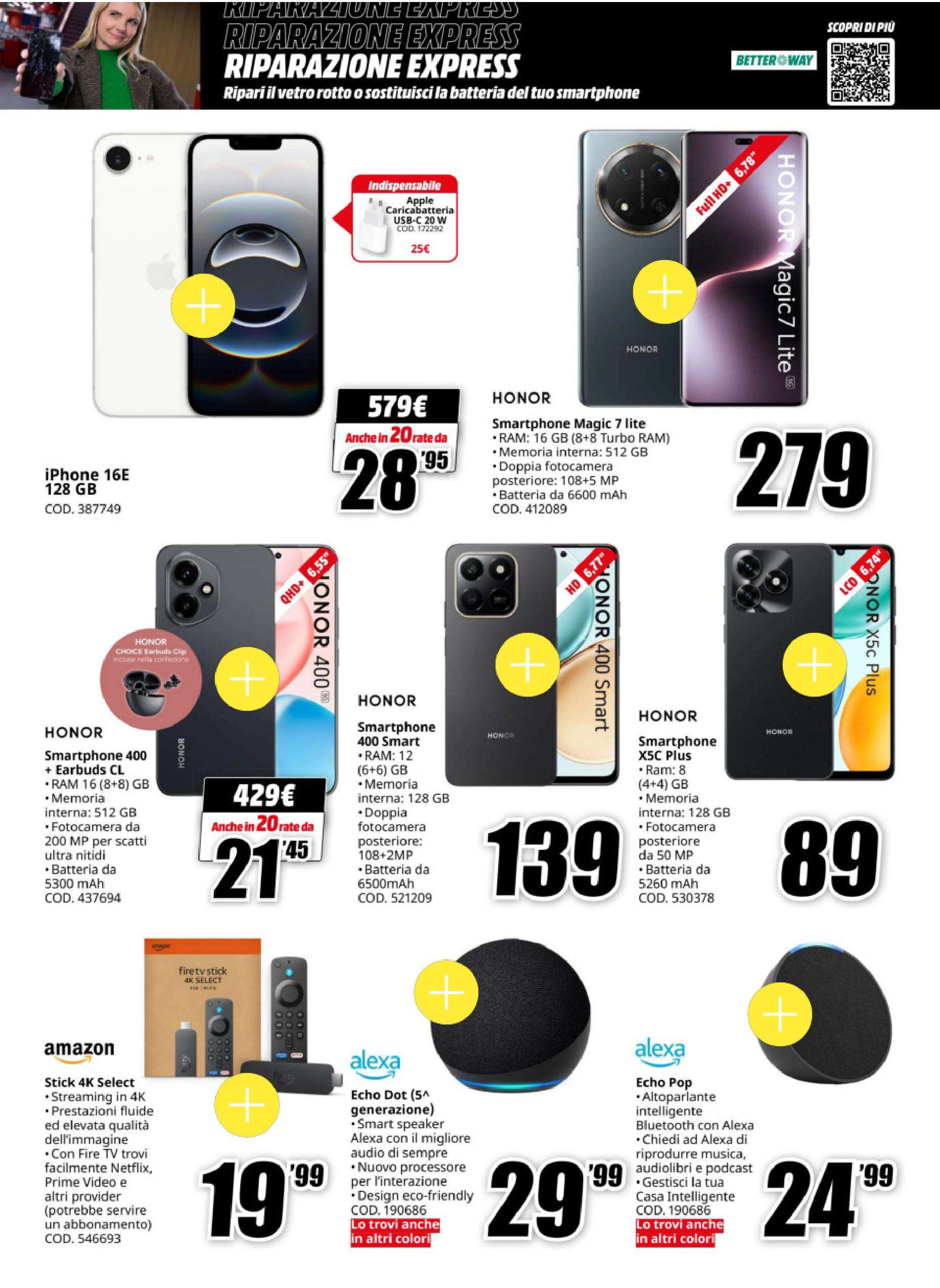 Completano il quadro delle offerte i prodotti mobile, guidati da Samsung Galaxy S25 Ultra da 256 GB. Lo smartphone si presenta con un comparto fotografico da 200 MP oltre a un processore all’avanguardia, proposto al prezzo di 849 euro, anche a rate.