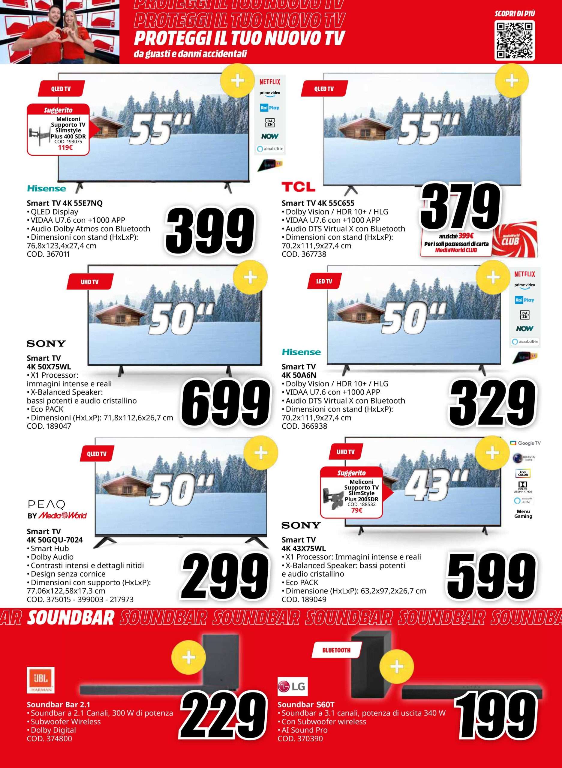 Tra quelle che MediaWorld propone in prima pagina, troviamo lo smart TV Samsung da 55" a 999 euro. Il televisore vanta display OLED, processore NQ4 AI Gen 2, design contour e tecnologia Adaptive Sound Pro che garantisce suono autentico. È anche compatibile con i supporti TV da muro.