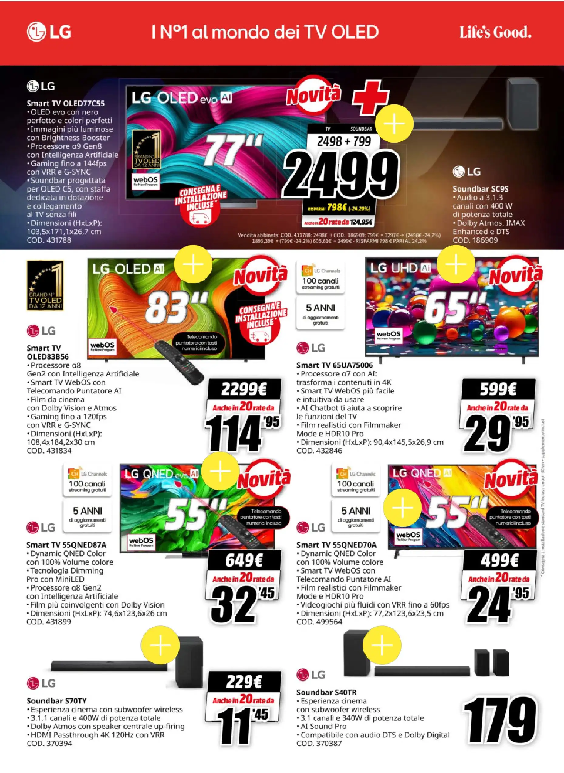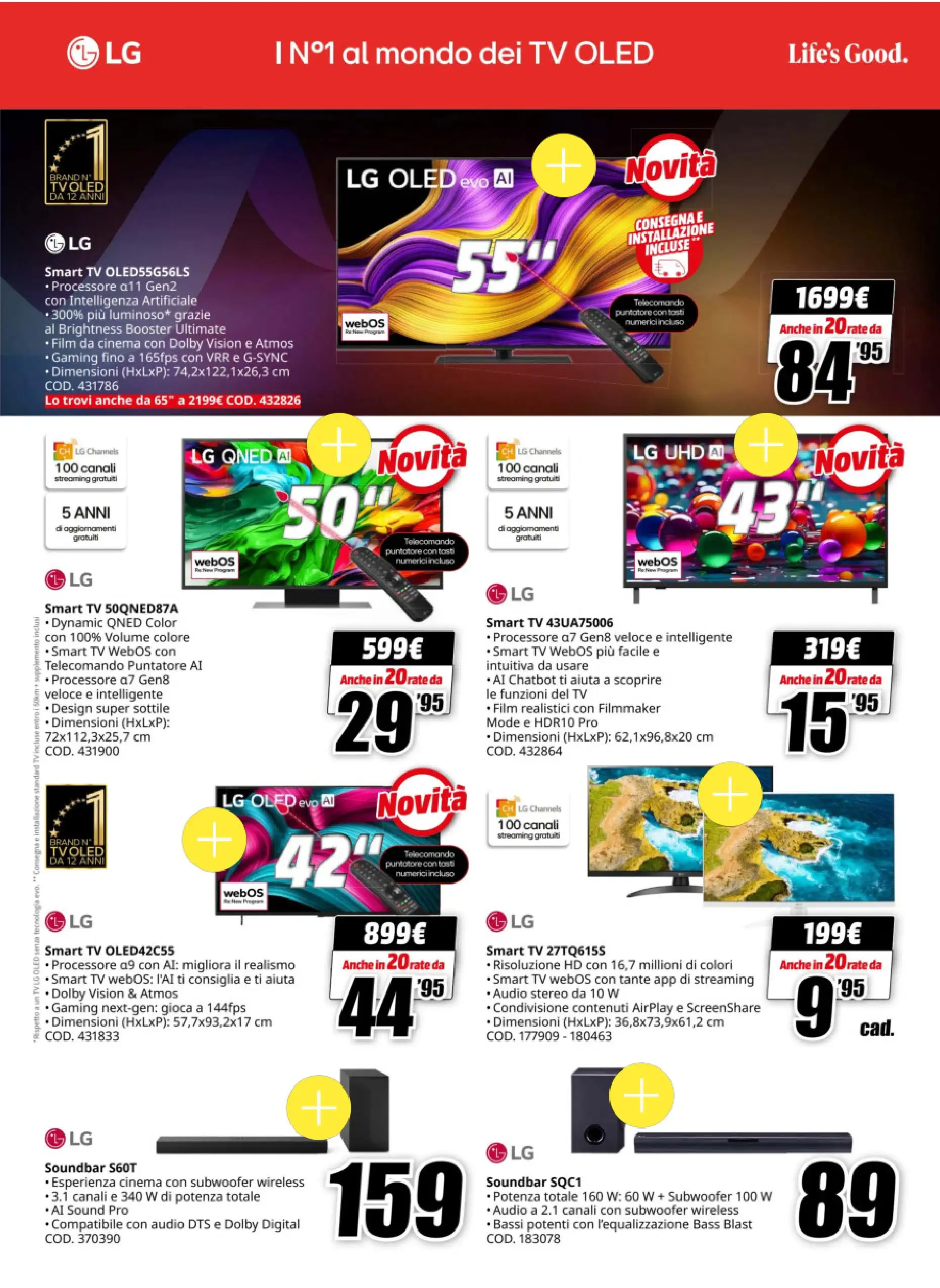 Ecco alcune tra le offerte più interessanti. La prima è la smart TV LG 4K, con schermo OLED da 55 pollici, processore AI e tecnologie Dolby Vision e Atmos. Il prezzo è di 999 euro, con consegna e installazione incluse, oppure in 20 rate a 49,95 euro.