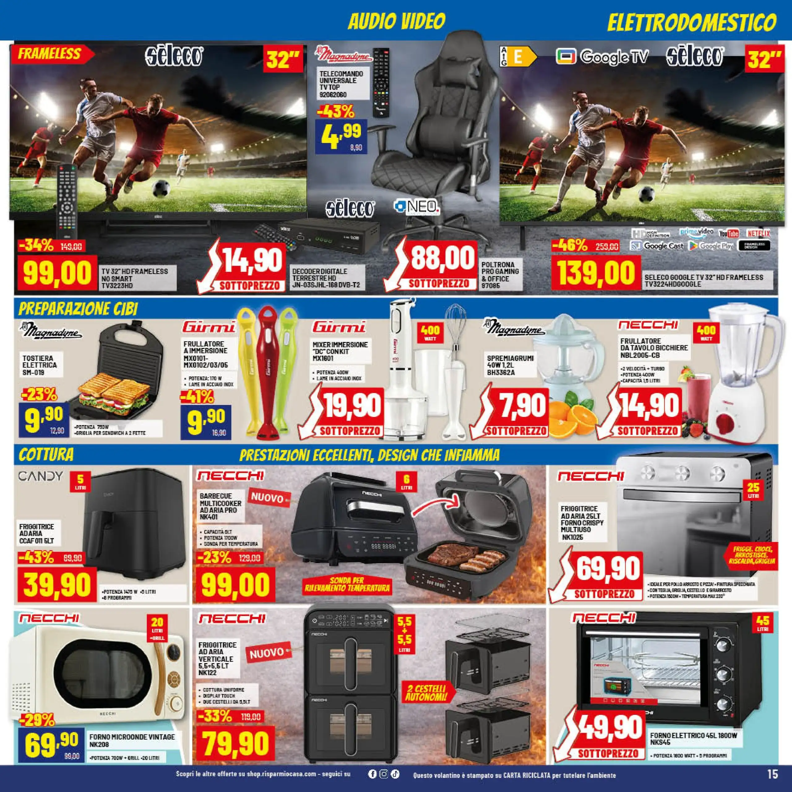Il volantino RisparmioCasa ti apre con un’offertissima su due grandi elettrodomestici firmati Candy: parliamo della lavatrice da 7 kg con 16 programmi e connettività NFC al prezzo eccezionale di 199 euro, e dell’asciugatrice da 9 kg con sistema a pompa di calore e NFC a 299 euro. Ottimo prezzo anche per le TV Seleco, entrambe da 32 pollici: quella smart con Google TV ti costerà, eccezionalmente, solo 139 euro con uno sconto del 46%; quella senza funzioni smart ha un costo di appena 99 euro, scontata del 34%.