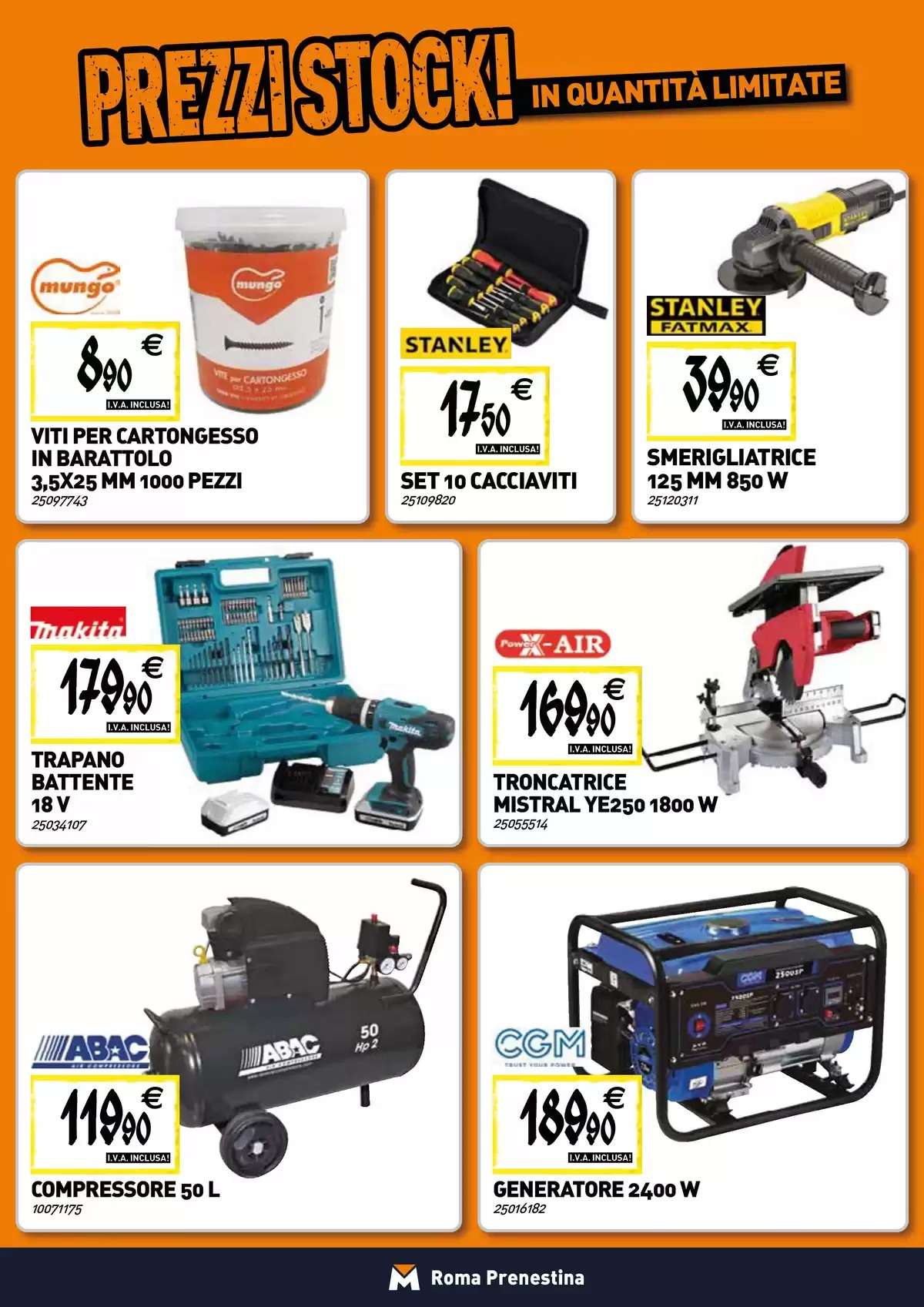 Ottimo prezzo per la smerigliatrice Stanley Fatmax, in offerta a 39,90 euro; la troncatrice Mistral è in offerta a 169,90 euro, mentre il compressore da 50 litri a 119,90 euro. Per chi pratica giardinaggio, due offerte: la motosega da potatura a 65,90 euro e la motosega 49,3 cc a 84,90 euro.