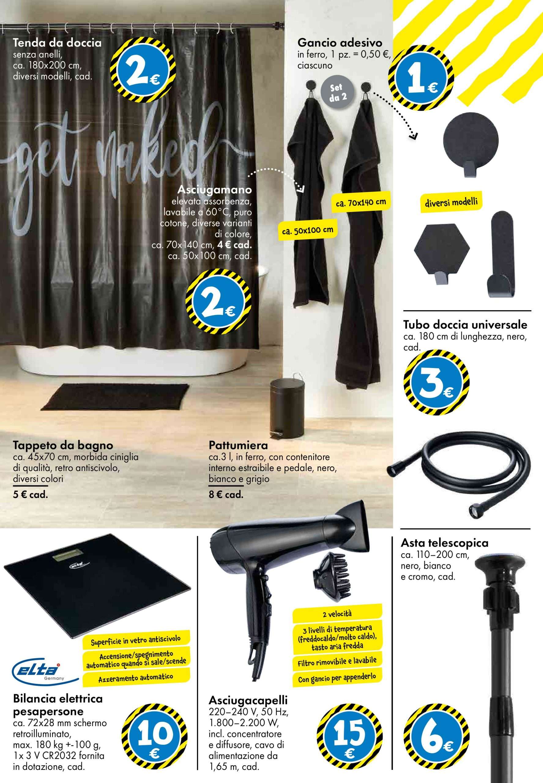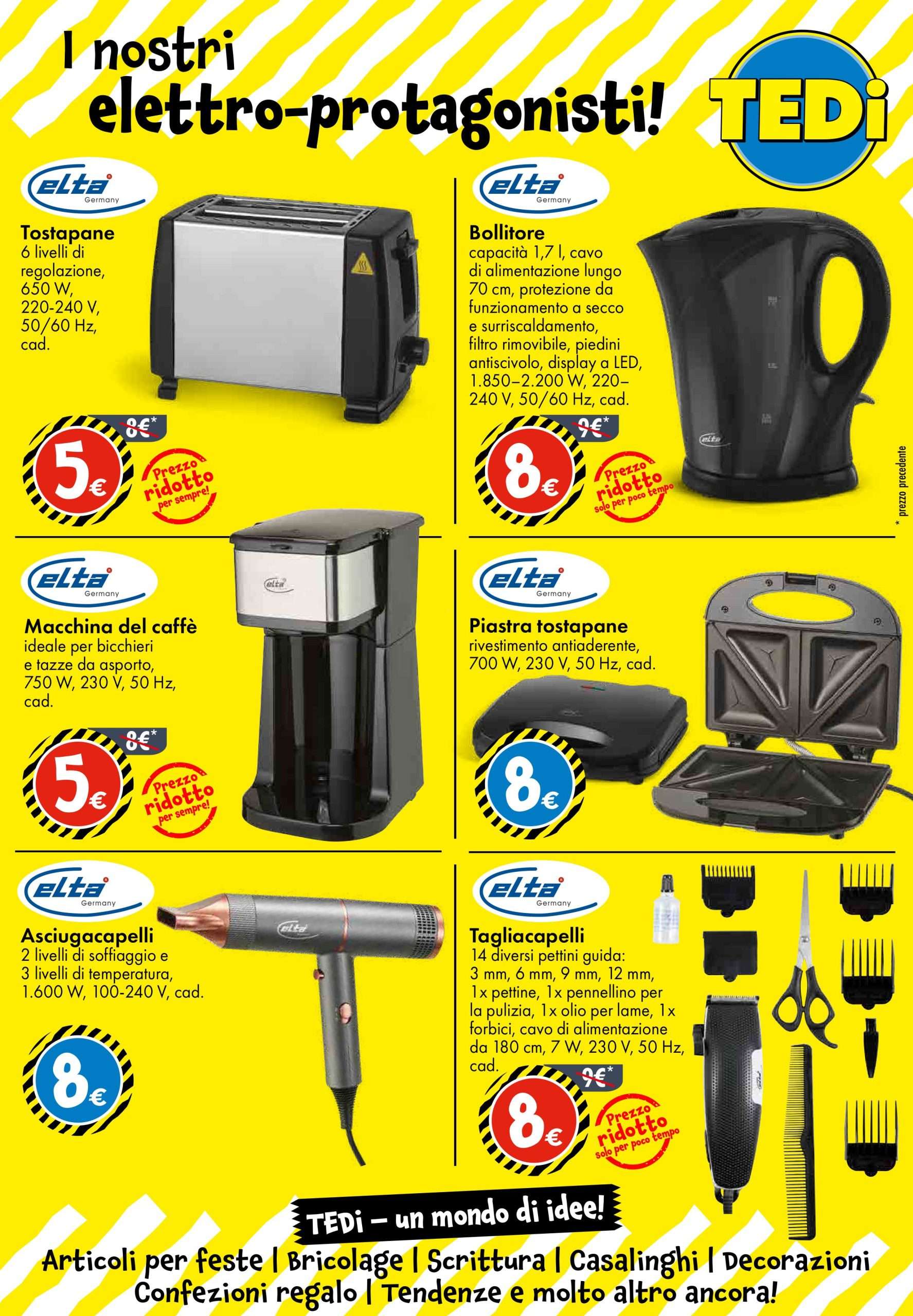 Da segnalare anche l’asciugacapelli da 1.600 W con 3 livelli di temperatura al prezzo di 8 euro e il tagliacapelli completo di 14 pettini guida, forbici e accessori, disponibile a sempre a 8 euro. Per chi desidera rinnovare il bagno, il volantino TEDi propone la tenda doccia a 2 euro, gli asciugamani in puro cotone da 2 a 4 euro e i ganci adesivi in ferro in confezione da due pezzi a 1 euro.