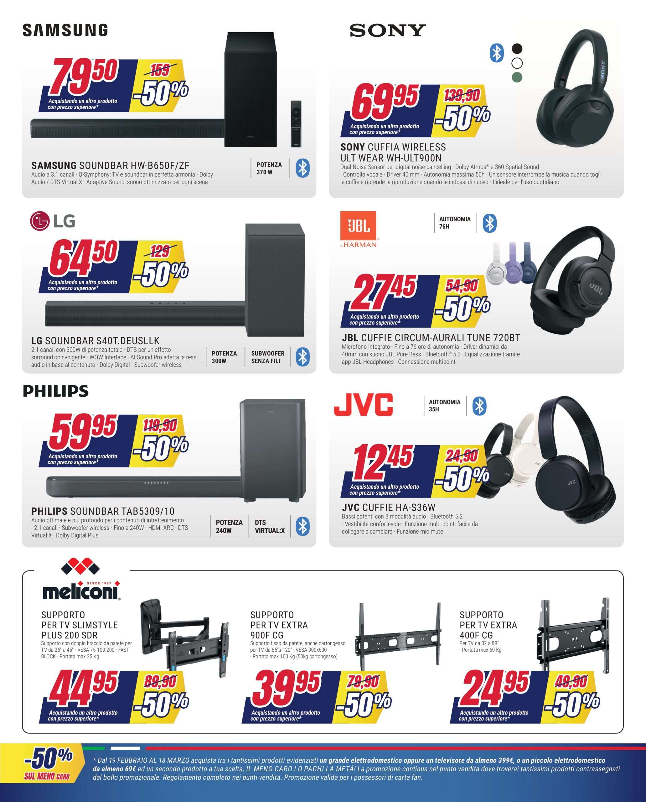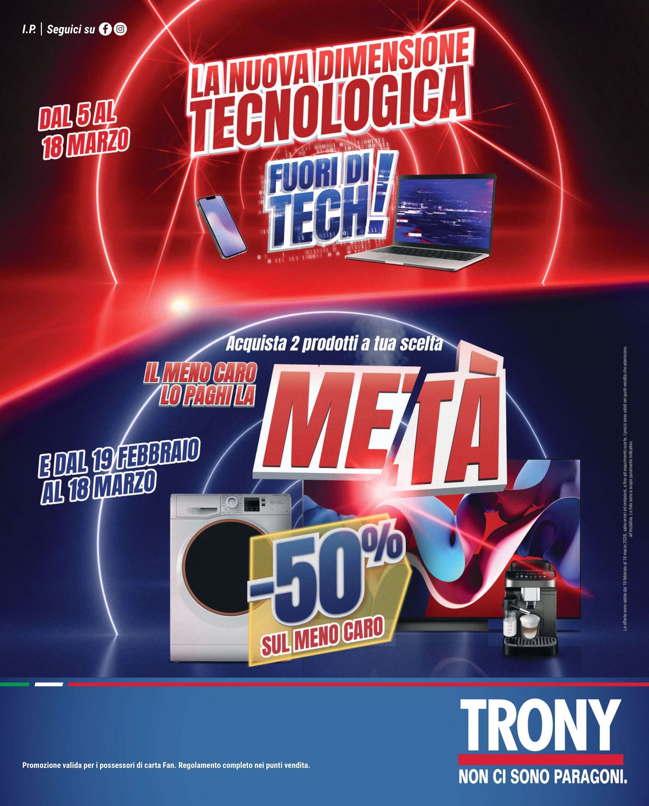 Il nuovo volantino Trony porta una doppia promozione: fino al 18 marzo, troviamo sia l’offerta “Fuori di Tech!" che il 50% di sconto sul prodotto meno caro, acquistandone due.
