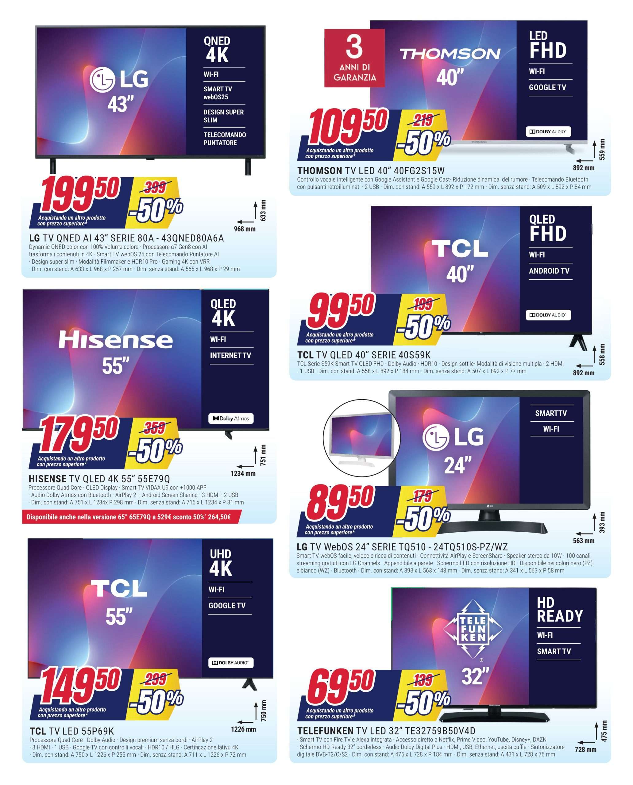 Una veloce carrellata delle migliori offerte. Tra le smart TV, segnaliamo la Samsung TV NEO QLED da 85" a 749,50 euro, scontata del 50% se abbinata a un altro prodotto. C’è anche la TCL LED da 55" UHD 4K a 149,50 euro, sempre a metà prezzo acquistando un secondo prodotto più caro.