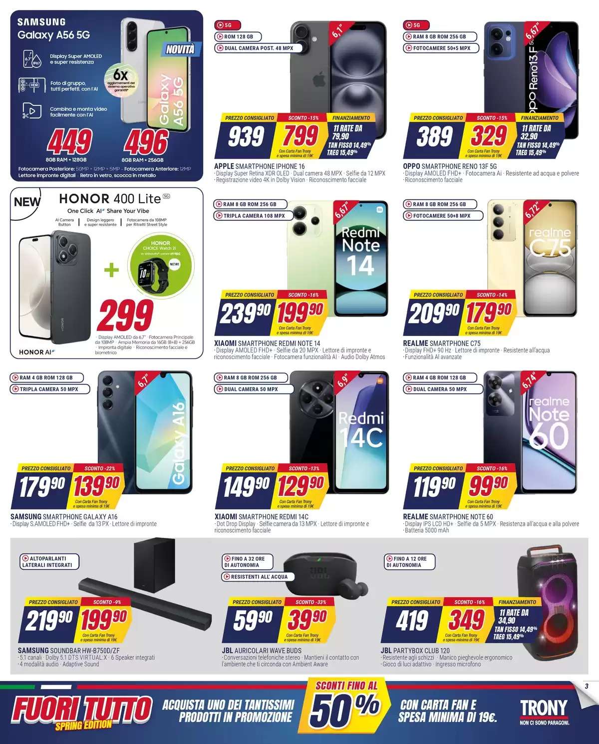 Il volantino Trony con gli sconti fino al 50% partirà ufficialmente domani, giovedì 17 aprile, e proseguirà fino al 7 maggio. È possibile accedere agli sconti solo se in possesso di Carta Fan Trony (gratuita), con una spesa minima di 19 euro. Inoltre, grazie al pagamento rateale, puoi acquistare oggi e iniziare a pagare tra 3 mesi in 11 rate. La promozione è attiva nei punti vendita aderenti e online.