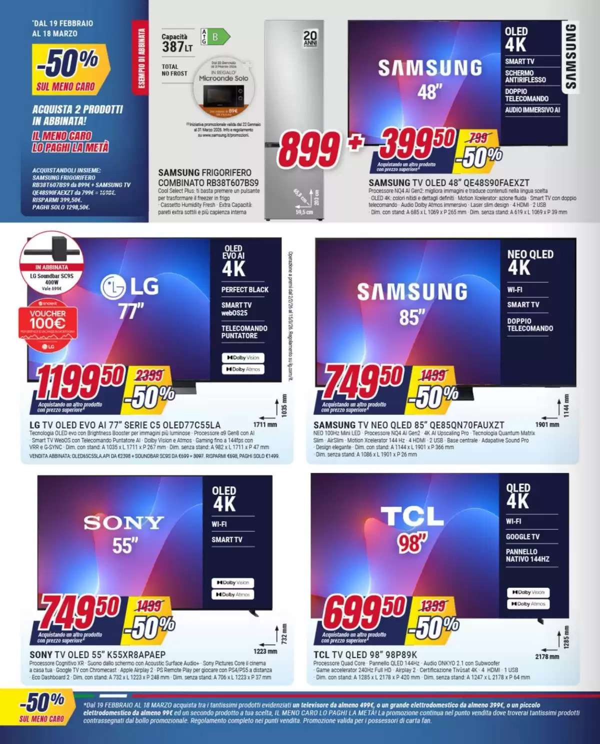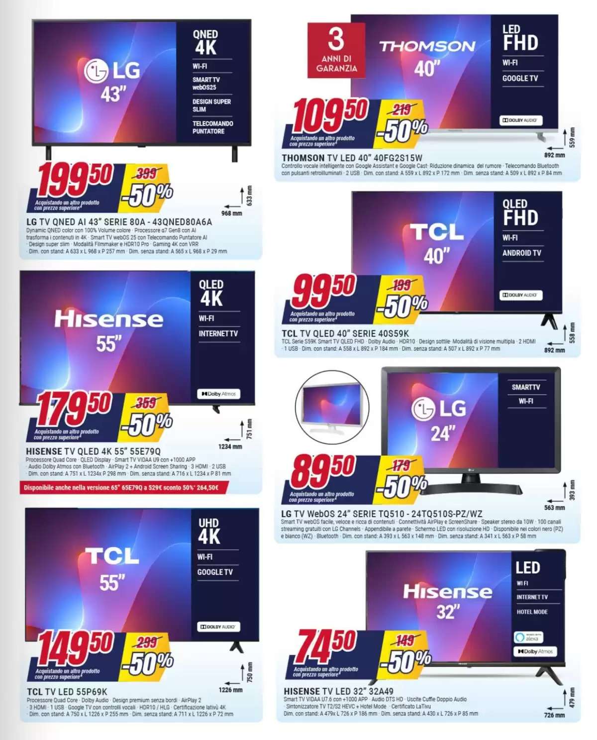 Tra i prodotti che aderiscono alla promozione, ci sono diversi elettrodomestici – grandi e piccoli -, comprese le smart TV. Tra le più interessanti che puoi ottenere a metà prezzo segnaliamo la smart TV Hisense QLED 4K da 55" a 179,50 euro, la TCL QLED da 40" a soli 99,50 euro e la Thomson LED, sempre da 40", a 109,50 euro. Tra quelle con più funzionalità troviamo invece la smart TV LG OLED EVO AI da 77" a 1.199,50 euro (sempre a metà prezzo) e la Samsung TV NEO QLED da 85" a 749,50 euro.