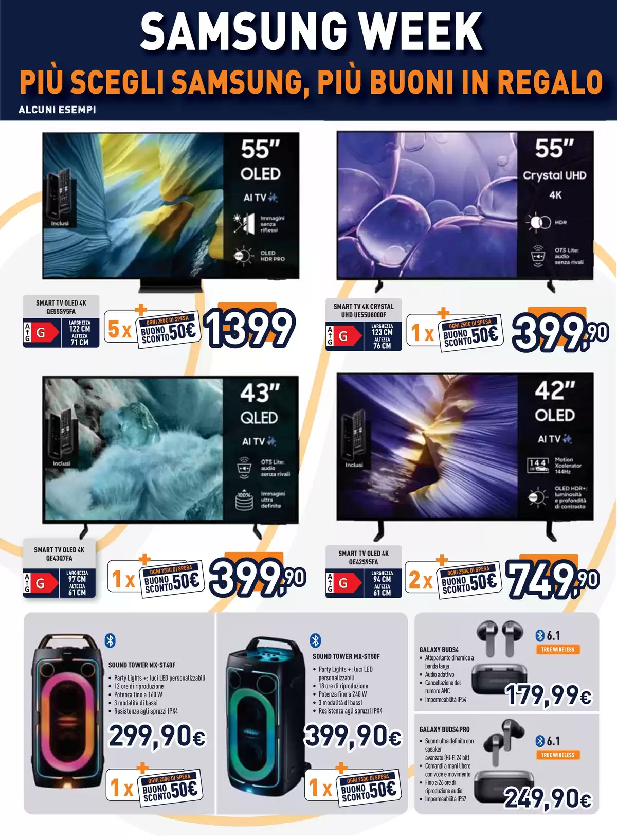 Sguardo infine alle smart TV: ben 7 buoni sconto da 50 euro (350 euro) per chi acquista la Smart TV OLED 4K da 77" a 1999 euro. La Smart TV 4K Crystal UHD da 85", invece, è disponibile a 899,90 euro, e dà diritto a 3 buoni sconto. Ottimo prezzo per la Smart TV 4K Crystal UHD da 55", che a 399,90 euro permette di ricevere un buono.