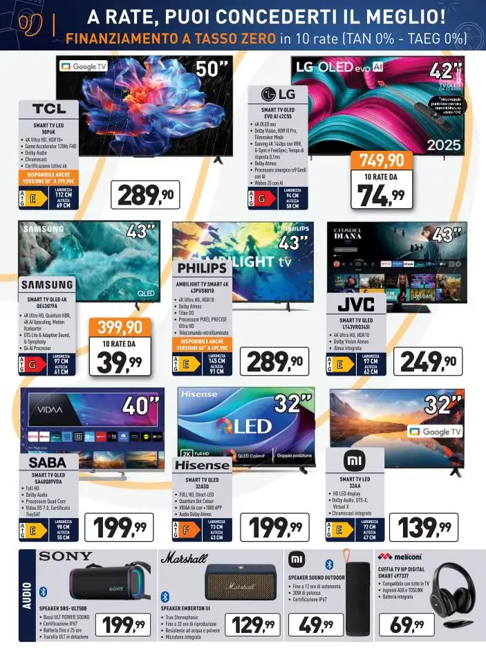 Iniziamo la carrellata con la smart TV Haier da 65" QLED che Unieuro propone a 449 euro, con possibilità di pagamento in dieci rate. Il modello offre risoluzione 4K Ultra HD, Quantum Dot, Dolby Audio, assistente integrato e uno schermo da 65 pollici con cornice sottile. L’acquisto include un bonus per gli appassionati di sport: dodici mesi di DAZN Full del valore di 539,88 euro.