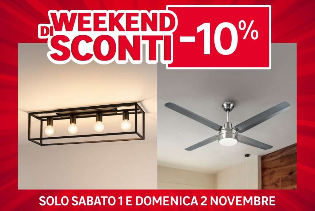 Da Leroy Merlin, il prossimo weekend è ricco di sconti: scegli il tuo nuovo lampadario o ventilatore da soffitto, attiva il tuo profilo Homy e approfitta subito dello sconto del 10%. Hai tempo soltanto il 1° e il 2 novembre per approfittarne!