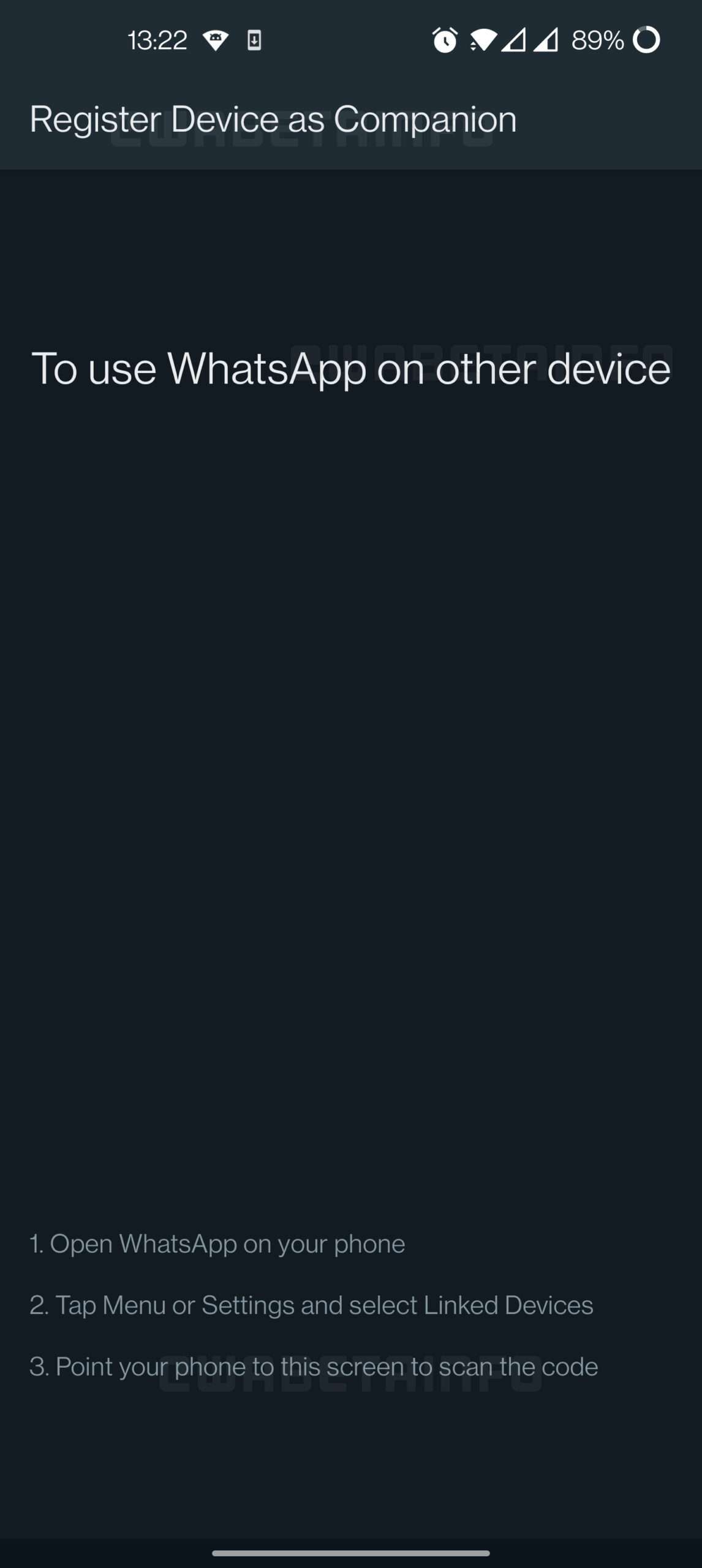 L’immagine fa riferimento a WhatsApp Beta per Android in versione 2.22.10.13. La schermata in questione apparirà nel momento in cui dovessi decidere di utilizzare il tuo account su un altro dispositivo. Al fine di completare l’operazione, sembra sia necessario puntare lo smartphone principale verso lo schermo del telefono secondario, così da collegarlo mediante scansione di un codice QR.