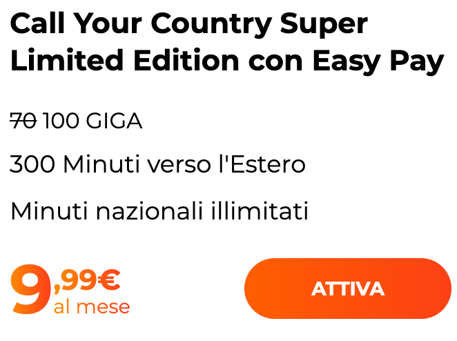 Call Your Country Super Limited Edition non prevede alcun contributo di attivazione. In pratica, l’unica spesa da sostenere sarà quella relativa alla SIM.