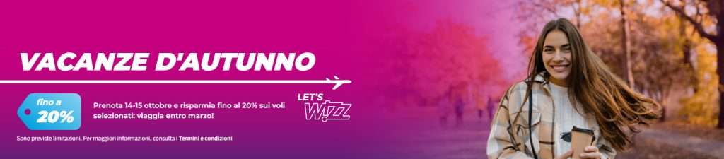 Se ancora non hai in programma una gita fuori porta, questo è il momento giusto per organizzarla: la promo WizzAir dedicata alle vacanze d’autunno con sconti fino al 20% sarà valida soltanto fino al 15 ottobre, per viaggi tra il 21 ottobre e il 26 marzo. Approfittane subito, i posti sono limitati: tariffe speciali come questa volano via in fretta.