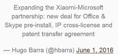Xiaomi e Microsoft hanno firmato un accordo che vedrà le società collaborare assiduamente per il futuro. Lo ha annunciato Hugo Barra, vice presidente di Xiaomi, su Twitter. Come parte dell’accordo, Xiaomi inserirà i software Microsoft Office e Skype su alcuni dei suoi telefoni Android a partire da settembre 2016. L'elenco dei dispositivi include Mi 5, Mi Max, Mi 4s, Redmi Note 3 e Redmi 3.